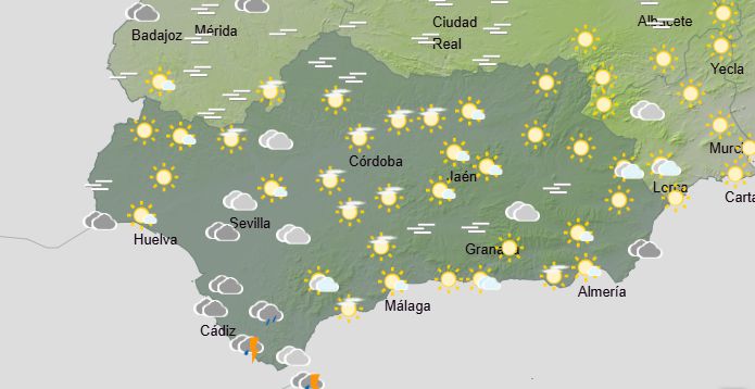 La Aement anuncia para hoy en Andalucía: intervalos de cielos nubosos, acompañados de chubascos durante la primera mitad del día, más intensos y persistentes en el área del Estrecho, donde pueden ser localmente fuertes y tormentosos; tendiendo a quedar cielos poco nubosos o despejados al final del día. Nubes bajas y brumas matinales en la vertiente atlántica. Temperaturas mínimas en ligero descenso o sin cambios; máximas en ligero descenso en la vertiente mediterránea, en ligero ascenso o sin cambios en el resto. Heladas débiles en las sierras, moderadas en las del interior oriental. Vientos entre flojos y moderados de componente norte.