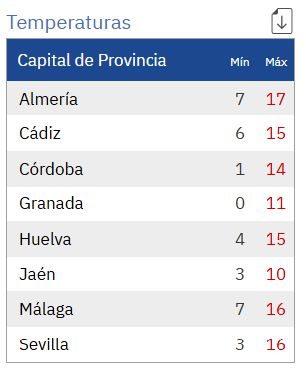 La Aemet prevé para hoy en Andalucía: cielos poco nubosos o despejados, con intervalos de nubes altas en la vertiente atlántica y aumentando a nubosos en el tercio oriental, donde pueden ir acompañados de precipitaciones débiles en las sierras al final de la tarde. Cota de nieve por encima de los 1000 metros. Temperaturas mínimas en descenso en la vertiente atlántica, con pocos cambios en el resto; máximas en ascenso en la vertiente mediterránea y con pocos cambios en el resto. Heladas débiles en las sierras y en el Alto Guadalquivir, localmente moderadas en el interior oriental. Vientos entre flojos y moderados de componente norte, tendiendo a componente oeste y con intervalos fuertes en el litoral mediterráneo.