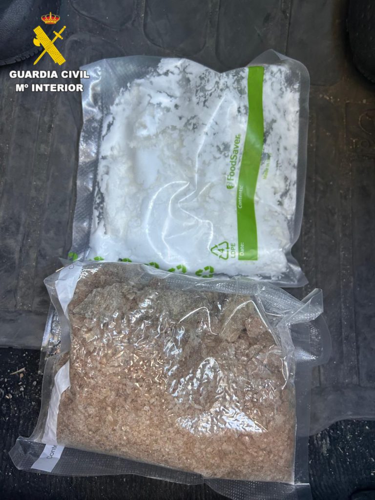 Tras preguntarle a los ocupantes del vehículo qué contenían, uno de ellos confesó a los agentes que se trataba de MDMA y Speed. Tras esta confesión, los guardias civiles procedieron a la apertura de los paquetes y, una vez confirmado que efectivamente podría tratarse de estas dos sustancias estupefacientes, procedieron a la detención de ambos, conductor y acompañante, como presuntos autores de un delito contra la salud pública por tráfico de droga.