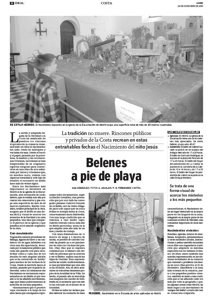 La grandeza del Belén de ese año de 2001 en la iglesia Mayor fue sublime, y como tal, fue referido en el artículo que bajo el título de “Belenes a pie de playa, la tradición no muere”, fue publicado en el Diario Ideal de fecha 24 de diciembre, en que se dice que “entre los Nacimientos más importantes se encuentra en Motril el de la iglesia de la Encarnación, una recreación de estilo hebreo, que se realiza este año por cuarta vez consecutiva y que ocupa una superficie de más de 40 m2. Emilio González, artífice principal de la obra, asegura que el Belén es una forma fácil y visual de acercar los misterios de la Navidad a los más pequeños, una idea que comparte el párroco de la iglesia y que justifica así el sentido originario de la obra”. Según la redactora de Ideal, Ana González, el Belén se había montado sobre vegetación natural procedente de Málaga y figuras de barro, juntamente con gran lago con correntía de agua que bajaba de un rio, colocándose en el mismo nenúfares naturales y pececillos. Una gran recreación histórica, sin duda, en la que Ideal quiso incidir, sobretodo, en “el numeroso público que cada año guarda cola para escudriñar todos y cada uno de los detalles de esta singular afición que se ha convertido en ·hobby para muchos de los vecinos de la costa”. Además, en este año de 2001, se le ha añadido movimiento a las figuras, lo que agrada mucho a los fieles que acuden a su contemplación. Ya lo decía Emilio, “Intentamos que el pesebre vaya creciendo a lo largo de los años hasta que consigamos representar todos los misterios”. De la misma forma, el diario provincial le hacía una extensa entrevista en la navidad de 2016, en la que se hacía constar que era el vigésimo año consecutivo que armaba el Belén y que en ese año llegaba a ocupar más de 40 metros cuadrados. Como era de prever, EL FARO, igualmente, le dedicaba una entrevista en el mes de diciembre de 2022 con el título de “La tradición del Belén vuelve a casa por Navidad”, donde refería las particularidades del Nacimiento de ese año, su pasión y su completa dedicación para engrandecer lo que para los motrileños constituía una autentica obra de arte religioso.