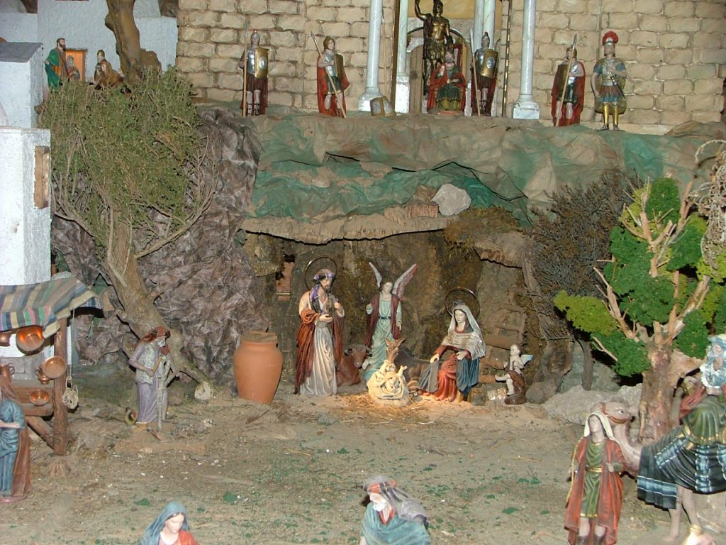 Esta navidad del año 2001, el misterio se compone del Niño Dios, la Virgen María y San José, juntamente con el buey, la mula y tres ángeles, figuras que tienen unas dimensiones de 25 cm. En cambio, los Reyes Magos subidos al camello y con pajes, junto con el resto de figuras secundarias son de 21 cm. Además, otras figuras de menor tamaño confieren una mayor visualización de las perspectivas y profundidades en su colocación sobre el Belén. Algunas figuras son de movimiento, tales como el herrero, el carpintero, el alfarero, cortadores de leña, pescadores, granjeros, pavos…, etc. Toda una recreación histórica que parece cobrar vida. Tal y como recoge la revista “Campanillas”, “las casas y demás construcciones, también al estilo hebreo son de fabricación propia, realizadas por distintos hermanos de la Archicofradía, en especial por Emilio González, principal artífice del montaje del Belén”. Como bien se refleja en el contenido de la revista, destacan por su elaboración artesanal con muy concisos detalles tales como techumbres de teja y azoteas o la grandiosidad del palacio de Herodes, con su riqueza de columnas y solerías de “mármol”. Y, como no, la delicada y conseguida ambientación que ofrece la iluminación eléctrica.