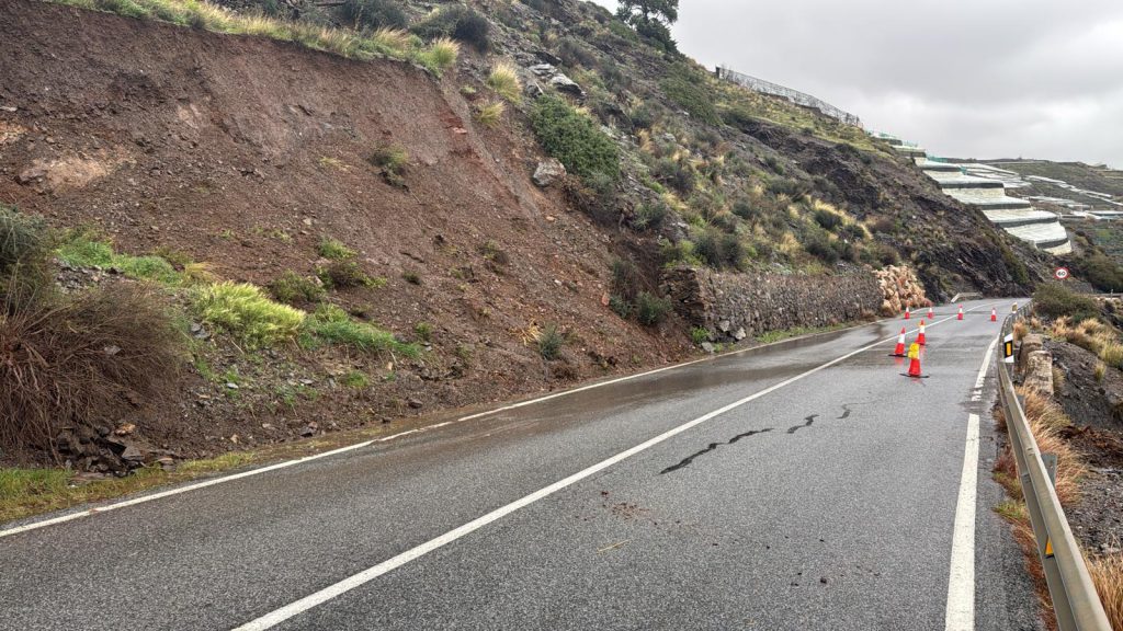 La borrasca ‘Leonardo’ sigue azotando la Costa Tropical y la provincia de Granada en general. La última hora, según ha podido saber EL FARO, pasa porque poco después de las dos y media de la tarde se ha cortado al tráfico rodado la carretera N-340 entre las localidades de Castell de Ferro y Casarones por riesgo de desprendimientos, concretamente, existe una ladera que se está desplazando progresivamente como consecuencia de la lluvia y el viento, por lo que de manera preventiva y para evitar daños mayores, se ha decido el corte de la vía.