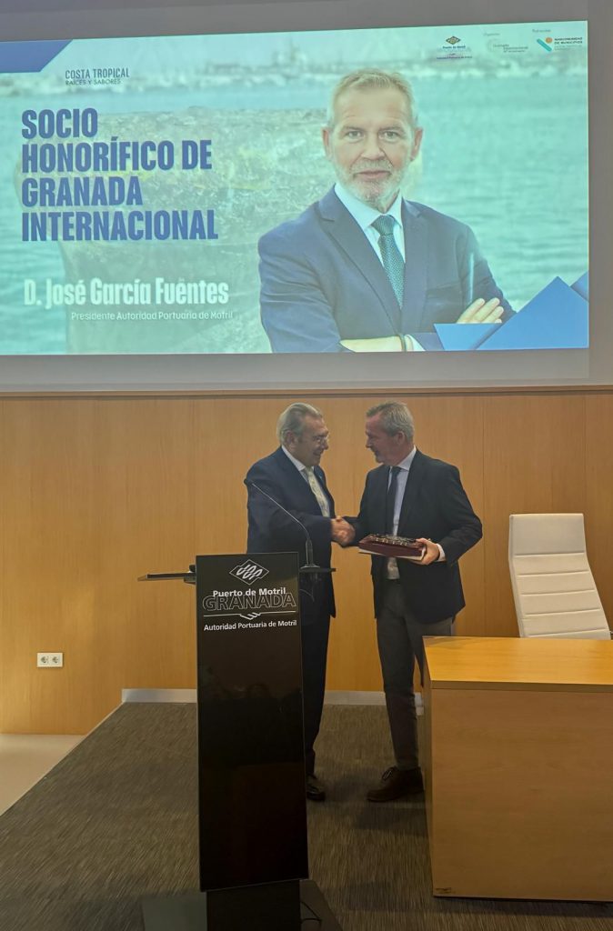 El acto ha servido para que la Asociación Granada Internacional nombre al presidente de la Autoridad Portuaria de Motril, José García Fuentes, como socio honorífico. El presidente tras recibir la distinción ha subrayado, «agradecer a la Asociación Granada Internacional el nombramiento en el transcurso de la jornada Turismo, Sostenibilidad & Gastronomía Excelente de la Costa Tropical celebrada en el Puerto de Motril, que ha puesto en valor el potencial turístico del destino y la apuesta por un modelo de desarrollo que impulsa el crecimiento económico, social y medioambiental. Enhorabuena a organizadores, ponentes y galardonados».