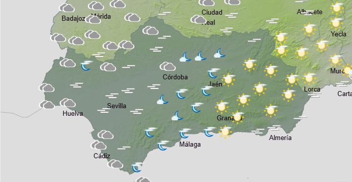 La Aemet prevé para hoy en Andalucía: intervalos de cielos nubosos, con nubes altas en la vertiente mediterránea y con nubes bajas en el resto, donde irán acompañadas de precipitaciones débiles dispersas al final de la tarde. Brumas y bancos de niebla matinales. Temperaturas en ligero descenso o sin cambios. Vientos flojos variables, aumentando a moderados de componente oeste a partir de mediodía, con intervalos fuertes y rachas muy fuertes en el litoral y en cotas altas del tercio oriental.