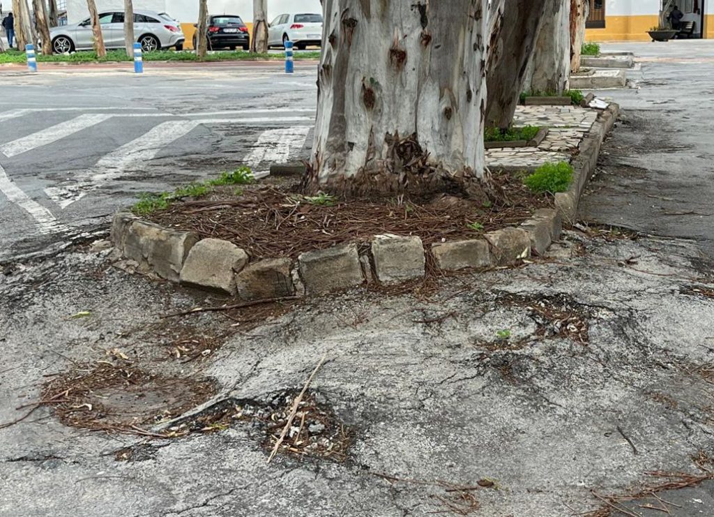 En las imágenes tomadas en el acceso se aprecia un firme muy deteriorado, con fisuras, hundimientos y áreas descompuestas que generan riesgo de tropiezos y caídas, especialmente en el entorno de los alcorques y pasos de circulación. A ello se suma el desencaje de bordillos y piezas que delimitan las zonas arboladas, con elementos movidos o fracturados que agravan la peligrosidad. También se observa pavimento irregular en tramos de acerado y zonas de paso, con piezas sueltas y rotas, así como señalización horizontal muy desgastada, lo que transmite una imagen de dejadez impropia de un equipamiento municipal tan sensible.