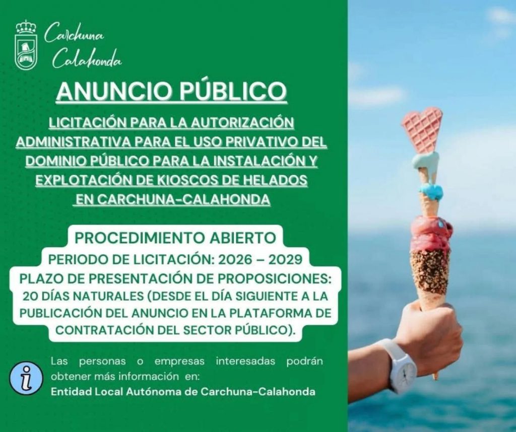 La Entidad Local Autónoma de Carchuna-Calahonda anuncia la licitación para la autorización administrativa del uso privativo del dominio público para la instalación y explotación de kioscos de helados.