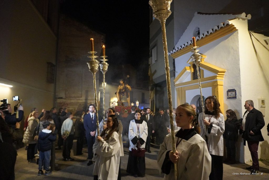 Tras la cruz parroquial se han dispuesto dos largas filas de hermanos de luz de la propia hermandad que iluminan el paso a su sagrado titular. Seguidamente, se han incorporado a la comitiva y en perfecta formación miembros del cuerpo Nacional de Policía en traje de gala. Tras ellos, ha marchado el trio de música de cámara de la asociación “Granamusic”, que todos los años figura como invitada al cortejo y que ha interpretado una selecta representación de marchas procesionales. A continuación, ha ocupado su lugar el cuerpo de acólitos que precede a las andas de Jesús de Pasión, que han sido portadas al hombro por su propio cuerpo de hermanos costaleros y dirigidas por su capataz, Pablo Alberto Rincón Correa. La imagen figura sobre un artístico adorno de claveles de color rojo, que la hermandad ha querido disponer a modo de guiño a la primera salida penitencial tras su llegada a Motril. Tras las andas, ha marchado la representación eclesiástica que componen los sacerdotes oficiantes en unión del párroco del Santuario de Nuestra Señora de la Cabeza, D. Hermes Moreno Arias, juntamente con la propia de la ciudad y representantes del cuerpo de la Policía Nacional, a los que ha seguido una inmensa multitud de fieles.