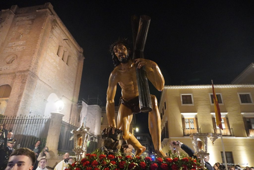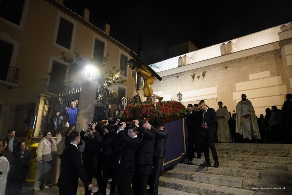 Concluida la santa misa, se ha dado lugar a los preparativos del vía crucis que han culminado con la apertura de la puerta lateral del crucero a las 20:55 h, momento en el que ha hecho su aparición la cruz parroquial escoltada por dos faroles de frente de procesión. Paralelamente, en el lateral del atrio, se disponía en perfecta formación el Cuerpo Nacional de Policía con su guion representativo, a la espera de que iniciara su marcha la imagen de Jesús de Pasión, que este año conmemora el 40ª aniversario de su hechura, razón por la cual preside este santo vía crucis.