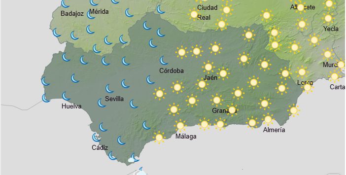 La Aemet anuncia para hoy en Andalucía: cielos despejados, con intervalos de nubes bajas matinales en el área del Estrecho. Temperaturas en ligero ascenso o sin cambios. Vientos flojos variables; flojos a moderados de levante en el área del Estrecho, ocasionalmente fuertes.