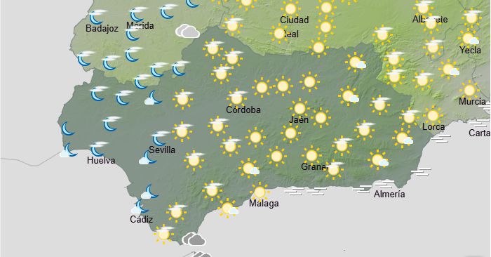 La Aemet anuncia para hoy en Andalucía: intervalos nubosos de nubes medias y altas y nubes bajas matinales en el mediterráneo oriental. En la mitad occidental, temperaturas mínimas en ascenso y máximas en descenso; con pocos cambios en la mitad oriental. Vientos flojos variables.