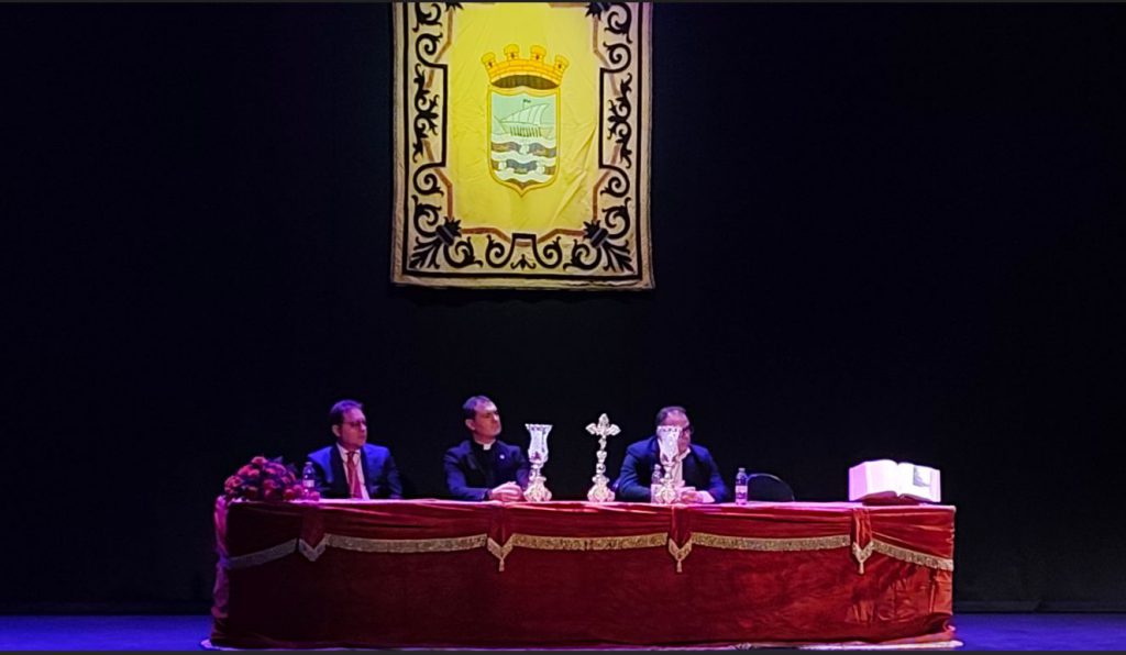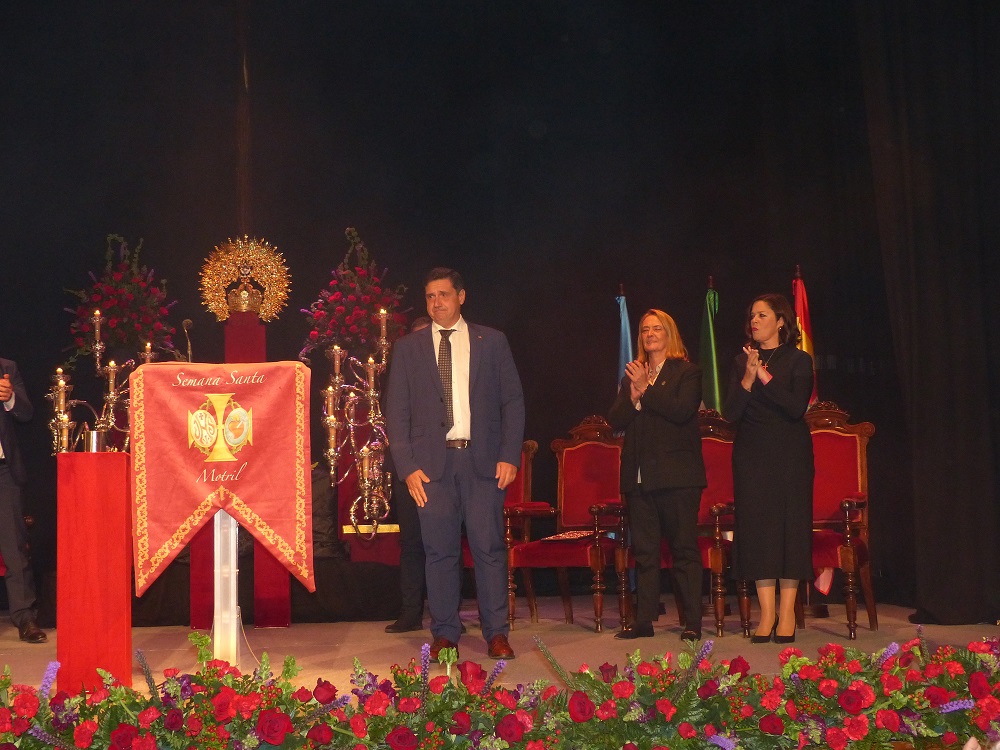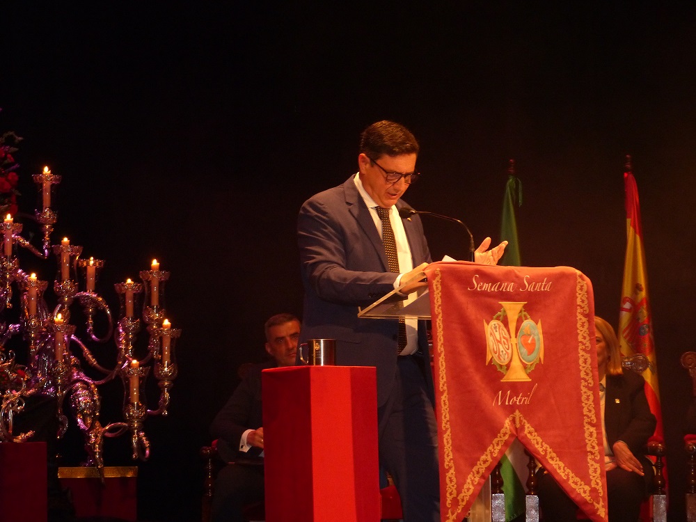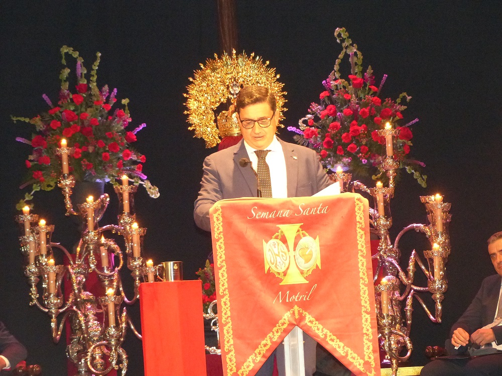 El acto daba comienzo a las 20:30 hrs con una cuidada escenografía dispuesta sobre el escenario del teatro. En el centro, la cruz de Nuestro Padre Jesús del Gran Poder, aquella que guía los pasos del pregonero en su sentir penitencial en la madrugada del ya jueves santo. A su lado, los candelabros de cola del paso de la Virgen de la Victoria y, a su frente, la Corona de Reina Gloriosa de Nuestra Señora del Rosario. Finalmente, a sus pies, los faroles del paso de Santo Sepulcro y, en un lateral, el estandarte de la Agrupación de Hermandades y Cofradías. Simbiosis pura, pues con la fraternidad que atesora personalmente el pregonero con el mundo cofrade local. En su honorable cometido de pregonero era acompañado por la alcaldesa de la ciudad, Luisa Mª García Chamorro, la nueva concejala de Relaciones Institucionales de Cofradías y Hermandades de Motril, María Teresa Jiménez Cabrera, el vicario parroquial, D. Alberto Sedano Rodríguez, el nuevo consiliario de la Agrupación de Hermandades y Cofradías de Motril, D. Alejando Pablo Anguís Rodríguez, la Madre María Teresa, priora del convento de las MM. Agustinas Recoletas Nazarenas, en cuya iglesia se encuentra al culto la imagen de Nuestro Padre Jesús del Gran Poder, el presidente de la Agrupación de Hermandades, David Merino Padial y, finalmente, el presentador del pregonero, Ángel Castilla Mancebo, hermano activo de la hermandad titular del miércoles santo al que unen grandes lazos de amistad con el protagonista del día. Ambiente de gala, pues para un Teatro Calderón que llenó todo su patio de butacas, palcos y plateas con un público variopinto en el que ocupaban sus lugares de honor la representación oficial de la ciudad, autoridades civiles y militares, cofradías y hermandades y hermanos en hermandad, amigos y público en general.