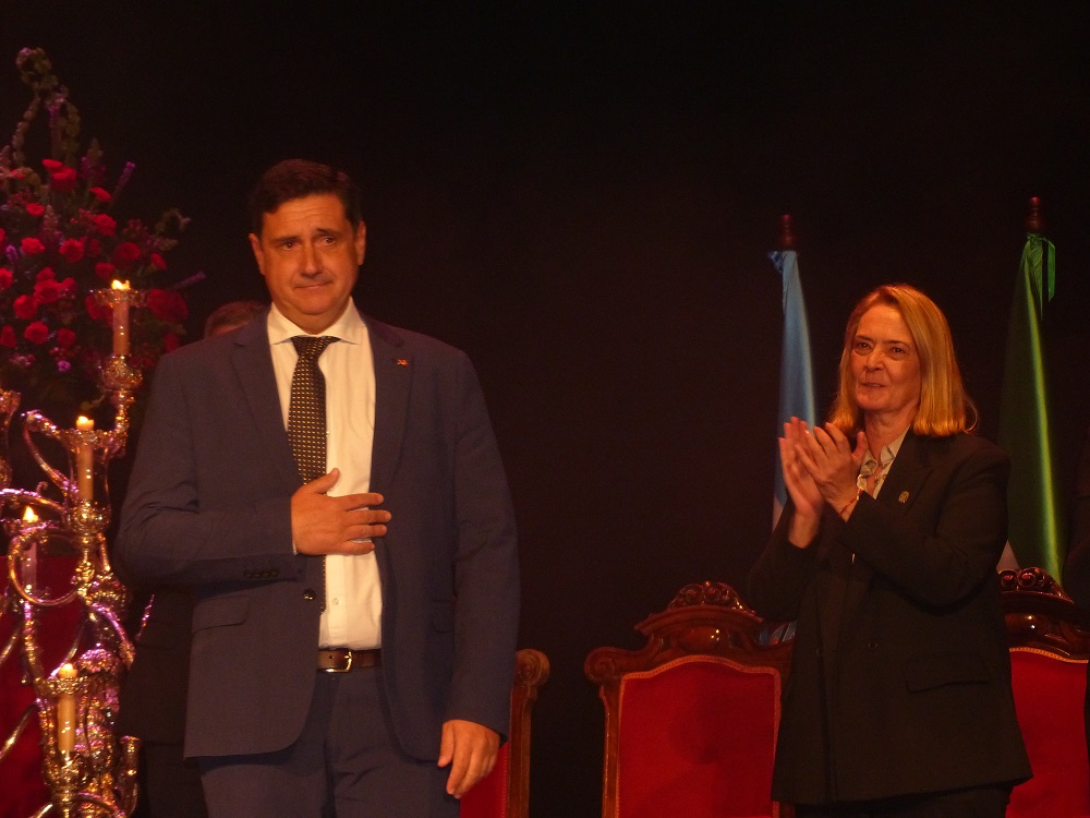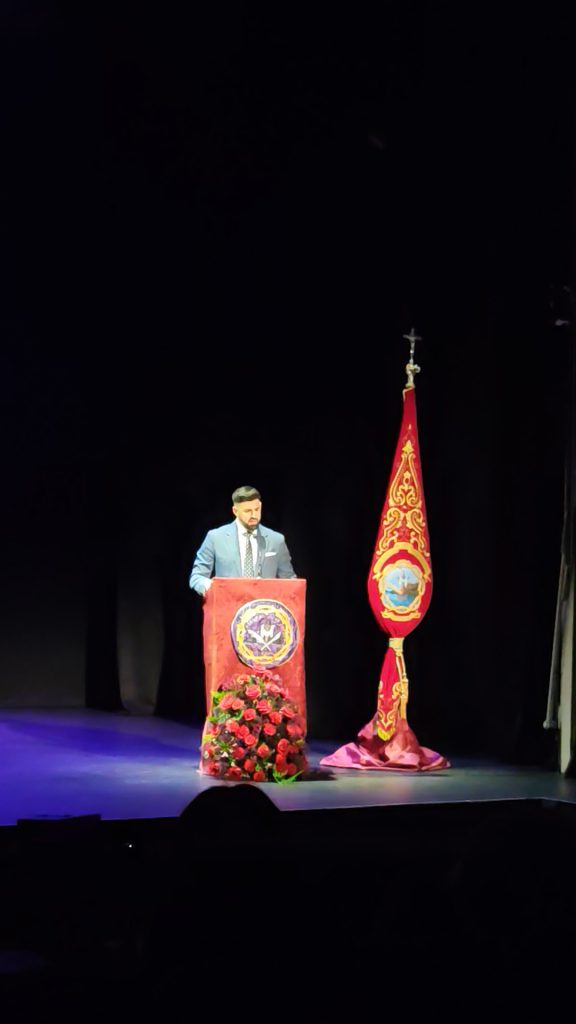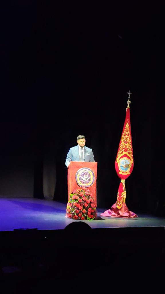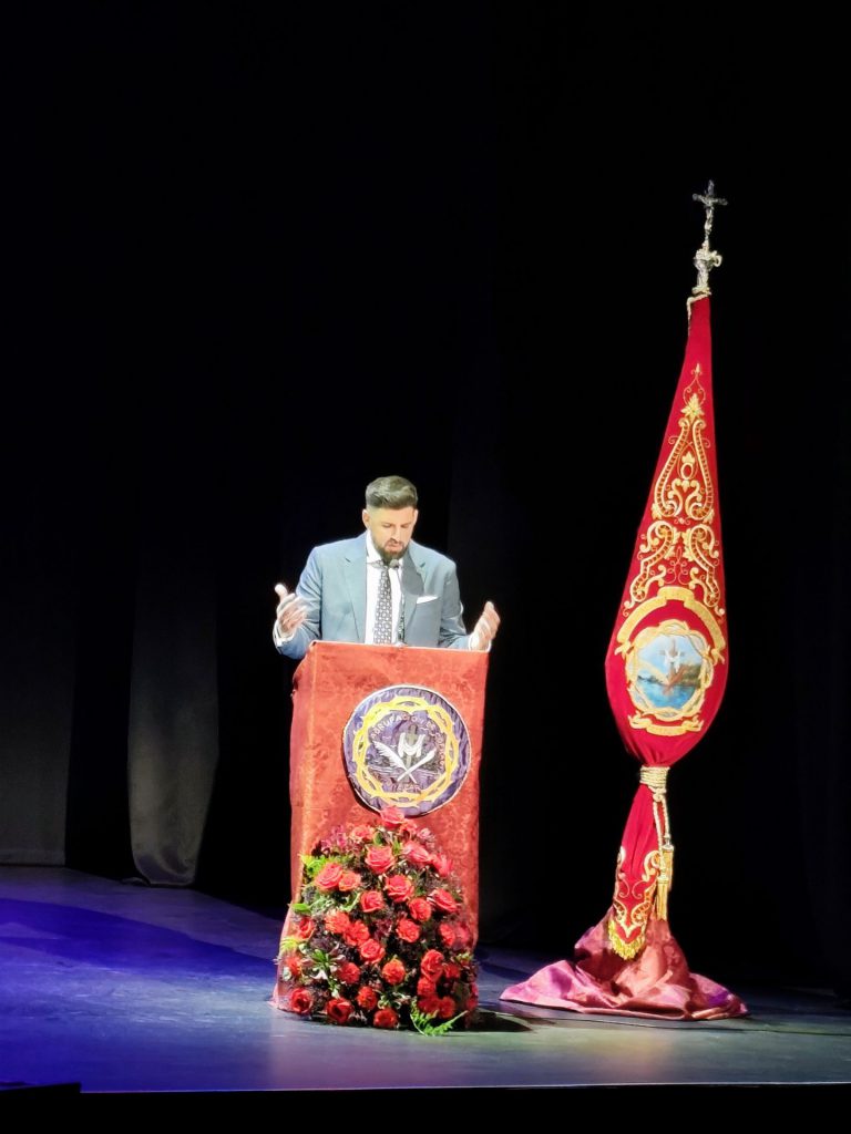 Entrando de lleno en su pregón y tras los saludas de rigor, tuvo palabras de agradecimiento para la Agrupación de Hermandades y Cofradías por su designación como pregonero de la Semana Santa de 2026, y a su presentador, al que nombró con su cariñoso apelativo de “Chicho”, al que definió como un luchador incansable que en todo momento se hace querer por sus amigos, compañeros y familiares, y del que destaco su labor cofrade en su papel de costalero y de auxiliar de pasos procesionales.