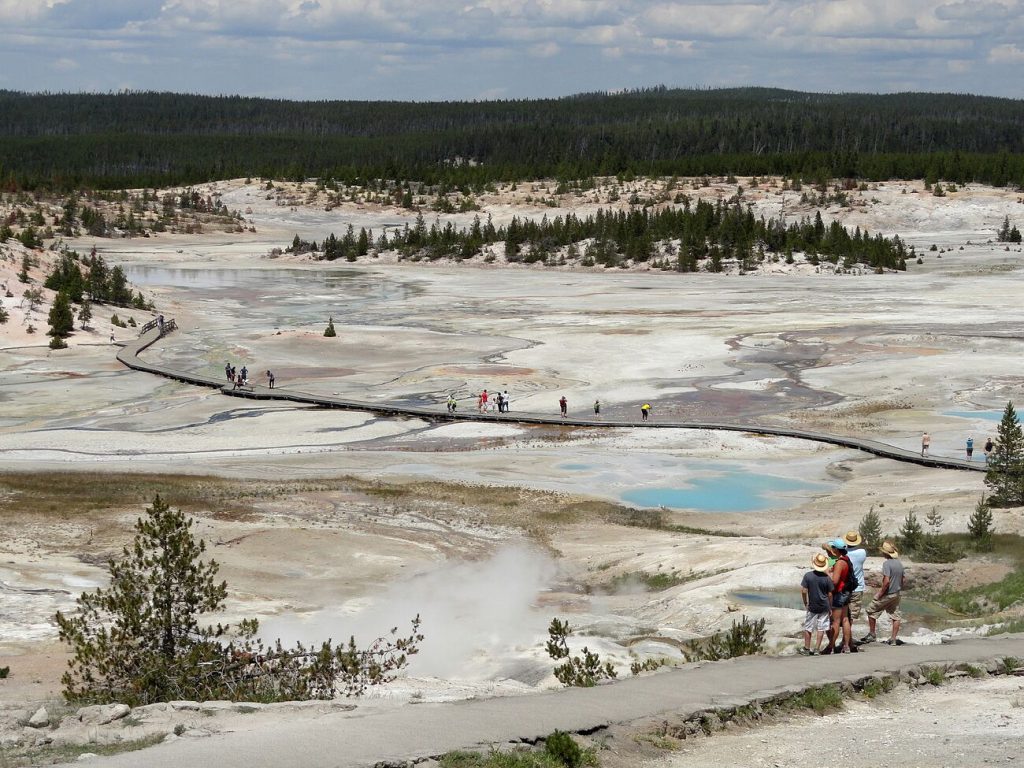 De todas las atracciones naturales del Parque, una destaca por su precisión y su espectacularidad: “Old Faithful” (“Viejo Fiel”). Es la gran estrella de Yellowstone, un géiser descubierto en 1870 por la “Expedición Washburn–Langford–Doane” que escupe agua hirviendo cada 30 minutos desde hace 30 años. Es uno de los 6 que los rangers son capaces de predecir. Otro de los rincones más extravagantes son las terrazas de las aguas termales Mammoth. Se trata de una montaña de piedra caliza, aguas burbujeantes y terrazas de travertino blancas y brillantes al noreste del Parque que se pueden explorar desde una pasarela de madera. Un lugar imprescindible es la Gran Fuente Prismática (“Grand Prismatic”), una de las tres lagunas termales más grandes del mundo. Sorprenden sus 112 metros de diámetro y unos 37 de profundidad pero, sobre todo, ese arcoíris de su orilla que va del rojo al naranja, amarillo, verde y azul, y que se explica por la alfombra microbiana que lo abraza. Cuentan en el Parque que Rudyard Kipling (1865 – 1936) visitó la laguna en 1889 y la rebautizó como el «medio acre del infierno» (Hell’s Half Acre).