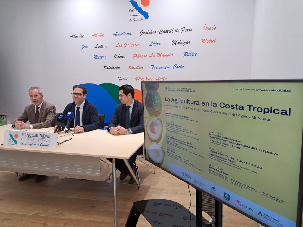 La sede de la Mancomunidad de Municipios ha acogido la presentación de una nueva jornada sobre la Agricultura en la Costa Tropical. En esta edición, que se celebrará el 9 de abril en el salón de actos del Edificio Azul de la Autoridad Portuaria de Motril, los expertos analizarán las “Claves para el cultivo: Control de Plagas, Gestión Digital del Agua y Mercosur”.