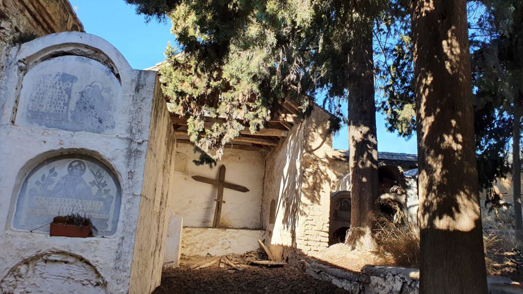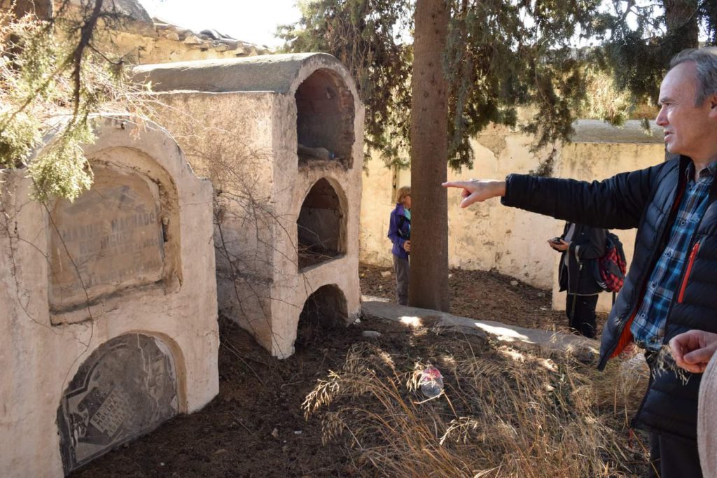 Este antiguo cementerio estuvo funcionando hasta los años sesenta del pasado siglo. Rosa, había conseguido la llave para que pudiéramos ver su interior. Todos los del grupo esperando que la llave girara y poder entrar pero, la llave no gira -probaba uno y después otro- y no hay manera, se resiste a todos los intentos. Isacio va hacia la esquina de la tapia con la intención de saltarla y entrar, lo intenta y no lo consigue, yo lo intento y con su ayuda consigo subir. Me deslizo por el lomo de las tumbas que hay junto a la tapia y salto al suelo del cementerio. El suelo esta acolchado por las hojas de los cipreses que han crecido mucho y no se ha limpiado desde que se abandonó, voy hacia la puerta y desde fuera me dan la llave para ver si la puedo abrir. Lo intento, pero tampoco se puede, giro la llave hacía un lado y otro, nada. Después de un rato de probaturas, Antonio va a su coche y trae un bote de «3 en 1» le hecha a la cerradura y tampoco, me lo pasa a mí que sigo dentro y le hecho todo lo que puedo, la llave se va moviendo hasta que se logra abrir: aleluya!