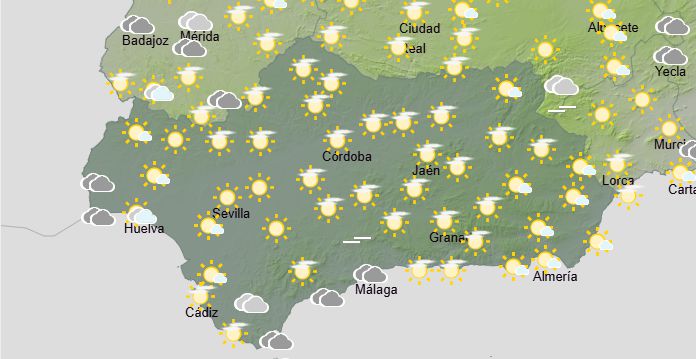 La Aemet anuncia para hoy en Andalucía: cielos con intervalos nubosos de nubes medias y altas, aumentando a cubiertos y acompañados de chubascos que se irán extendiendo por el tercio occidental durante las últimas horas del día. Temperaturas mínimas con cambios ligeros; máximas con pocos cambios en el extremo oriental y en la parte suroccidental de la comunidad, en ascenso en el resto. Vientos flojos variables, tendiendo a soplar de componente sur en la mitad occidental y de componente este en el resto, con intervalos moderados. Rachas muy fuertes de levante en el litoral mediterráneo oriental y en la provincia de Cádiz, y del sureste en la Serranía de Ronda.