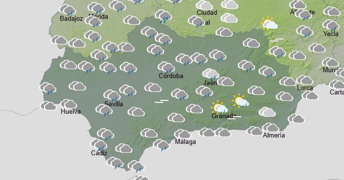 La Aemet anuncia para hoy en Andalucía: cielos cubiertos acompañados de chubascos, localmente fuertes y sin descartar que sean ocasionalmente tormentosos en la mitad occidental durante la primera mitad del día. Temperaturas mínimas con pocos cambios, localmente en ascenso en la vertiente atlántica; máximas en descenso. Vientos entre flojos y moderados de componente este; amainando a lo largo de la tarde en el interior. Levante fuerte en los litorales y en la provincia de Cádiz, con rachas ocasionalmente muy fuertes.