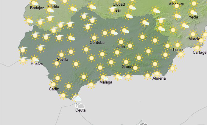 La Aemet anuncia para hoy en Andalucía: cielos poco nubosos o despejados, con intervalos de nubes altas por la tarde. Nubes bajas matinales en el litoral mediterráneo occidental. Temperaturas mínimas en ligero descenso; máximas en ascenso. Vientos flojos variables. Levante moderado en el litoral mediterráneo, con intervalos fuertes en el Estrecho; amainando a lo largo del día.