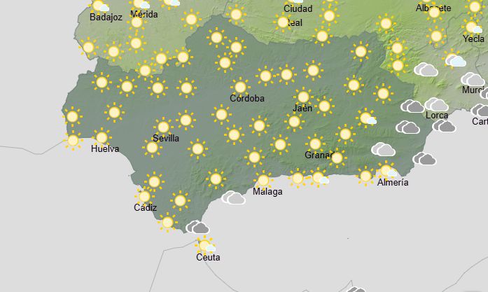 La Aemet anuncia para hoy en Andalucía: cielos poco nubosos o despejados en la vertiente atlántica e intervalos de nubes bajas en el resto, sin descartar alguna llovizna en el litoral mediterráneo. Temperaturas en descenso generalizado, salvo las mínimas de las comarcas centrales de la comunidad, sin cambios o en ascenso. Heladas débiles en las sierras orientales. Vientos de componente este, moderados en el litoral mediterráneo, disminuyendo por la tarde, y flojos a moderados en el resto. Levante moderado a fuerte en el Estrecho.