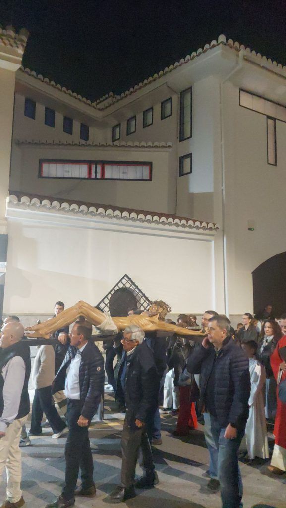 La salida del Santo Vía Crucis estaba prevista en la villa para las 21:00 hrs de la noche desde la Iglesia San Juan Bautista, en la parte baja del pueblo, donde estaban concentrados los feligreses y la totalidad de hermandades y cofradías de la villa. Allí, ante una iglesia repleta de fieles y devotos, se realizó la lectura de la primera estación, “Jesús es condenado a muerte”, que fue seguida por todos los presentes en absoluto silencio. Desde allí salió la sagrada imagen del Santísimo Cristo de la Buena Muerte a hombros de sus portadores, siendo seguida de una inmensa muchedumbre hasta la Calle Gardenias, donde se leyó la segunda estación, “Jesús carga la Cruz”. A partir de aquí, y durante la lectura de las distintas estaciones se realizaron los correspondientes relevos entre los hermanos de las diferentes cofradías para portar a Cristo crucificado.