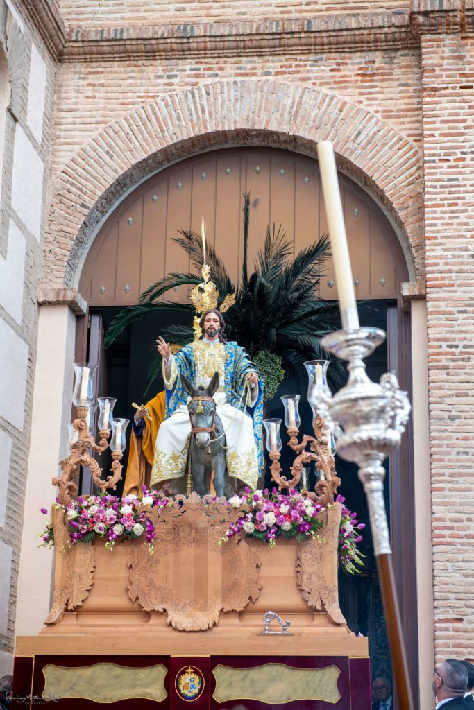 Sobre la canastilla, se muestra la imagen triunfante de Jesús a lomos de la Borriquita en su pose frontal para que pueda ser contemplada en su inmensa figura por todos los fieles que se aprestan en las aceras. La imagen titular es obra del escultor jiennense Antonio José Martínez Rodríguez, que fue concertada en el mes de mayo de 2012 y culminada en el mes de febrero de 2013. La efigie fue finalmente bendecida el domingo, 17 de febrero de dicho año, en una solemne función de iglesia que contó con la presencia del vicario territorial, D. Juan Bautista Amat, el párroco y consiliario, D. José Albadalejo Hernández y el sacerdote motrileño D. Javier Sabio Rodríguez.