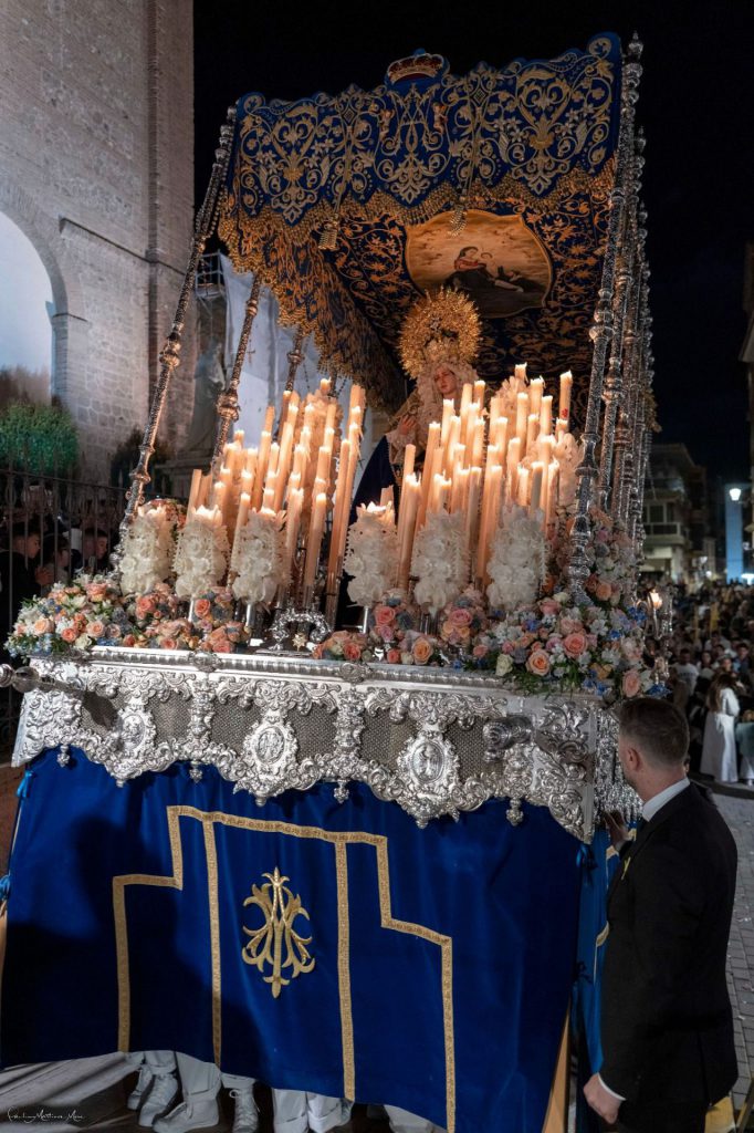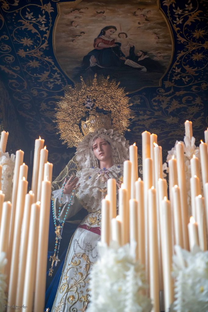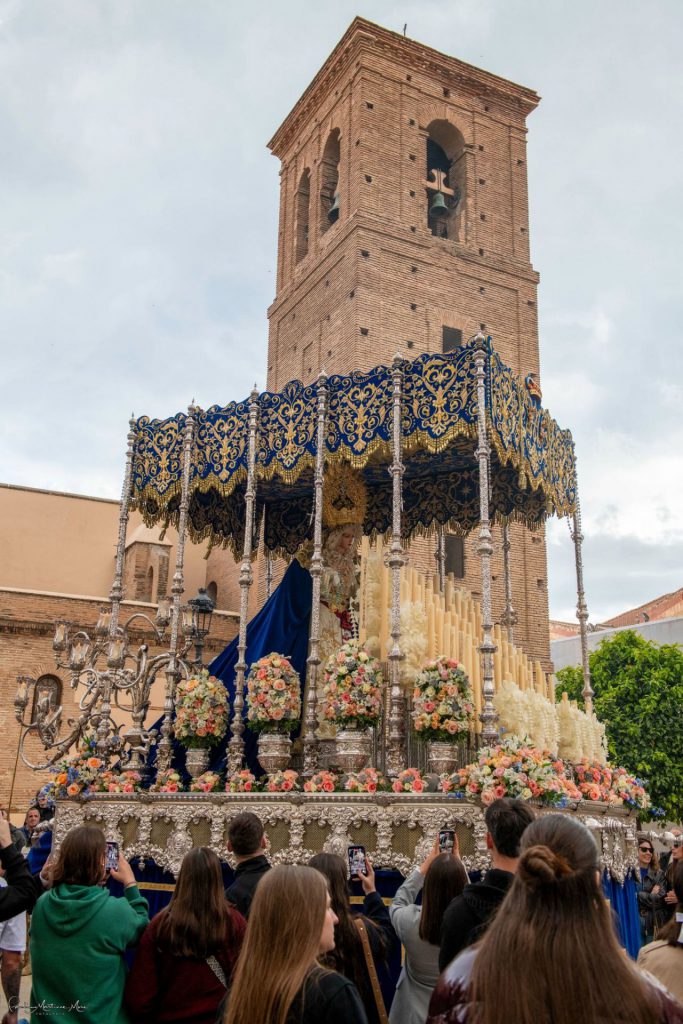 La imagen mariana es obra del mismo escultor de la efigie cristífera, Antonio José Martínez Rodríguez, y fue bendecida en la capilla del colegio de Nuestra Señora del Rosario en el mes de marzo de 2016. Figura la misma sobre la canastilla del paso revestida con una elegante saya realizada en tisú de plata que ha sido confeccionada en el propio taller de bordado de la hermandad. Muestra un llamativo tocado realizado en blonda con delicadas tablas que enmarcan su rostro y un rizado superior que le da un gran realce. Como brillantes aderezos luce puñetas de encaje bordadas a mano en tul y punto de aguja que han sido donadas por un hermano, así como diversos broches en plata que igualmente son donación de hermanos en hermandad. Además, en su frente, la candelería muestra dos velas pintadas con motivo del X aniversario de la titular mariana y otra que está dedicada a Cáritas Interparroquial, institución a la que se va a dedicar en este año el 50% de los donativos del apadrinamiento de la candelería. El paso mariano ha sido dirigido en labores de capataz por Carlos Miguel González, al que han acompañado como auxiliares Hilario Peña, Pablo Rodríguez Vallejo y Javier Blanes.