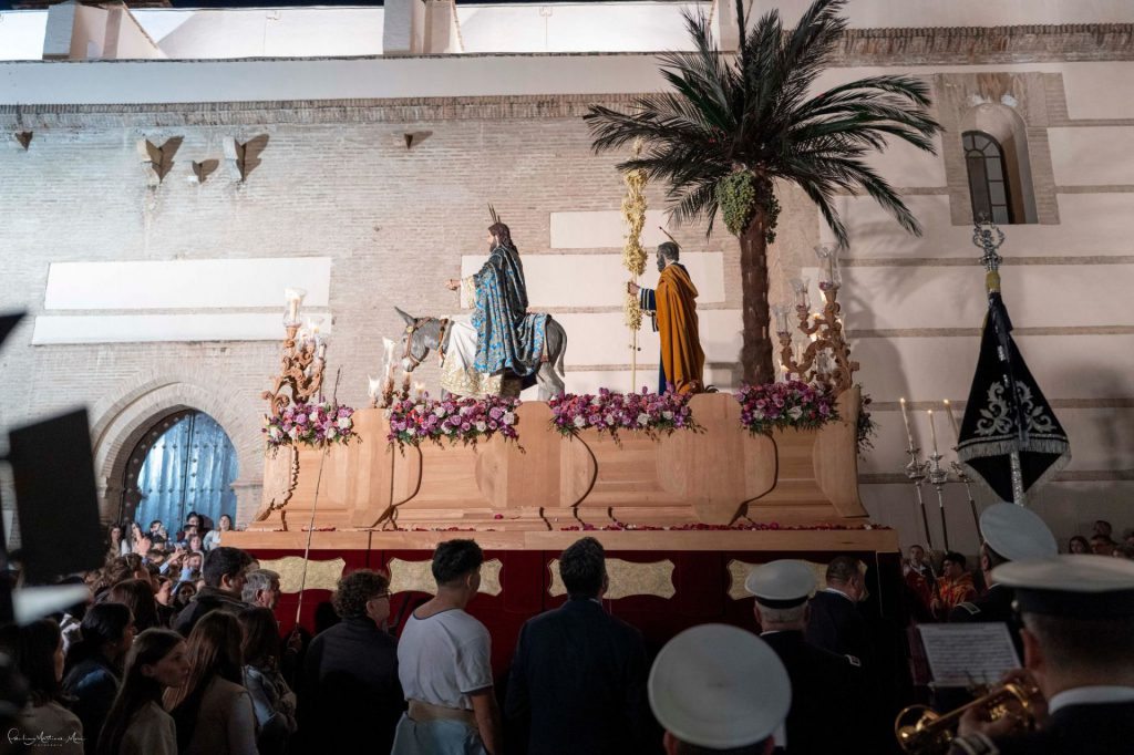 El paso de misterio figura comandado en labores de capataz por su actual hermano mayor, Francisco Pérez Lorenzo, que está asistido en labores auxiliares por Juan Maldonado Vázquez, Juan Arráez Lozano y Gonzalo Arcas Pérez. Ha cerrado esta sección cristífera la Agrupación Musical El Carpio (Córdoba), que ha dejado muy buena impronta de su saber hacer en la interpretación de marchas procesionales. Posicionada en el atrio, y con la imagen cristífera en el interior de la iglesia, se ha dejado oír la marcha “Virgen de las Angustias”, para continuar con el himno de España a la salida del paso de misterio y seguir con “Tu Dulce Rostro cautivo”. Ya en los momentos previos a la bajada de la rampa han tocado la marcha “Virgen de la Paz” para seguir con un conjunto de composiciones muy conocidas, entre las que se pueden citar “Al Rey de los Reyes”, “Est in gloria”, Jesús del Prendimiento”, Costaleros de fe”, “Tu humilde mirada”, la siempre admirada “Saeta” y la propia que remarca el título de la hermandad, “Entrando en Jerusalén”.