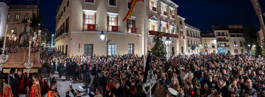 Impresionante ha sido la acogida que ha tenido la salida de los dos pasos procesionales a la calle desde la iglesia Mayor parroquial, con una plaza de España atestada de público, al igual que los accesos a las calles adyacentes. Momentos significativos del recorrido procesional han sido muy numerosos, entre los que podemos destacar el tránsito por la calle de las Cañas, donde la representación de Nuestro Padre Jesús Nazareno y María Santísima de la Esperanza les ha esperado en su pórtico para ofrecerle un ramo de flores a sus titulares. También junto a la ermita de Nuestra Señora del Carmen ha esperado la junta de gobierno de la cofradía de Nuestro Padre Jesús del Perdón y María Santísima de la Misericordia, que se han desplazado hasta la escalinata para felicitar a la junta de gobierno en su cortejo, mientras que la nave de la iglesia ha permanecido con sus puertas abiertas dejando ver el paso cristífero que ha de efectuar su salida penitencial en la tarde del martes santo. Igualmente de significativa ha sido la “levantá” a pulso del paso de la Virgen junto a la ermita del Señor de Junes. También ha estado presente en la avenida de San Agustín la representación oficial de la cofradía del Señor de la Humildad y la del Cristo de la Salud, frente a las que se ha efectuado una emotiva “levantá” en recuerdo de “Chiqui”, cofrade ejemplar donde las haya, fallecida en el año anterior. Y, como no, el encierro de los pasos en la iglesia, momento que se ha podido verificar a las 21:30 el de misterio y a las 22:00 h el de la Virgen del Rosario. Hay que hacer notar la impresionante acogida del público y fieles en general, ante una plaza de España atestada de gente, al igual que el atrio de la iglesia, donde ha sido dificultoso poder contemplar el movimiento de los pasos.