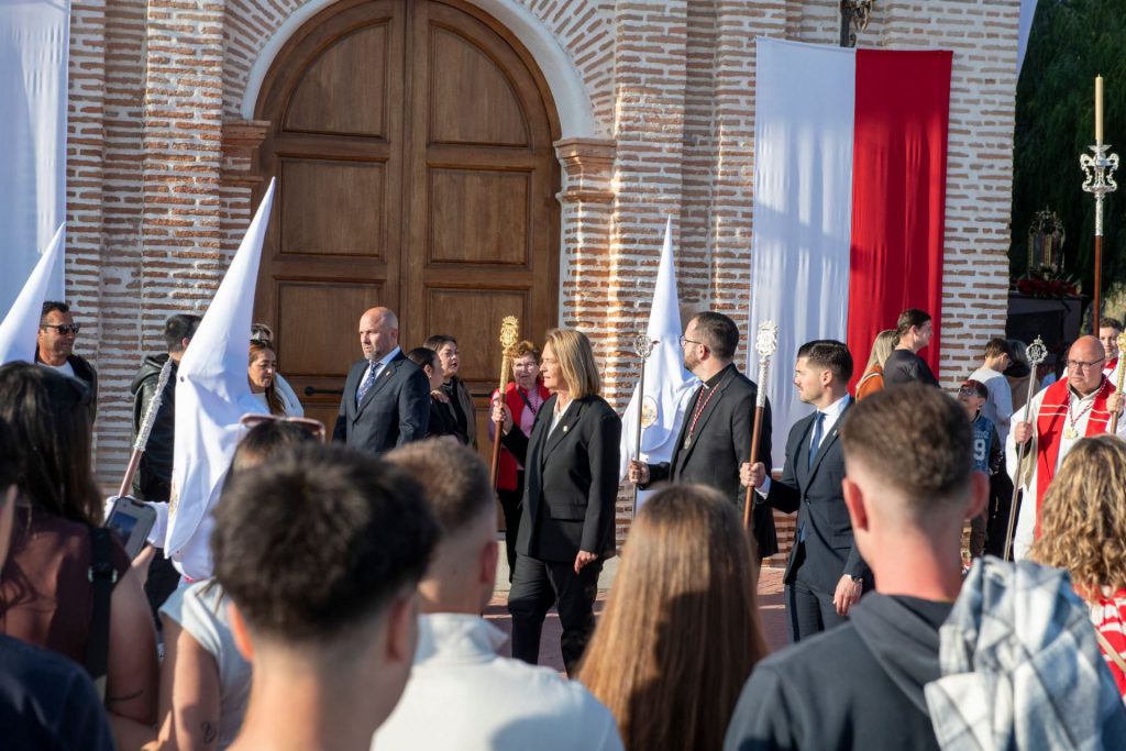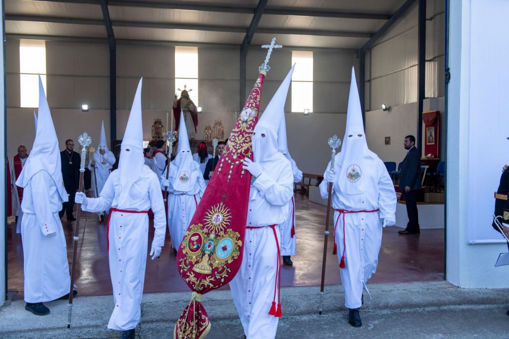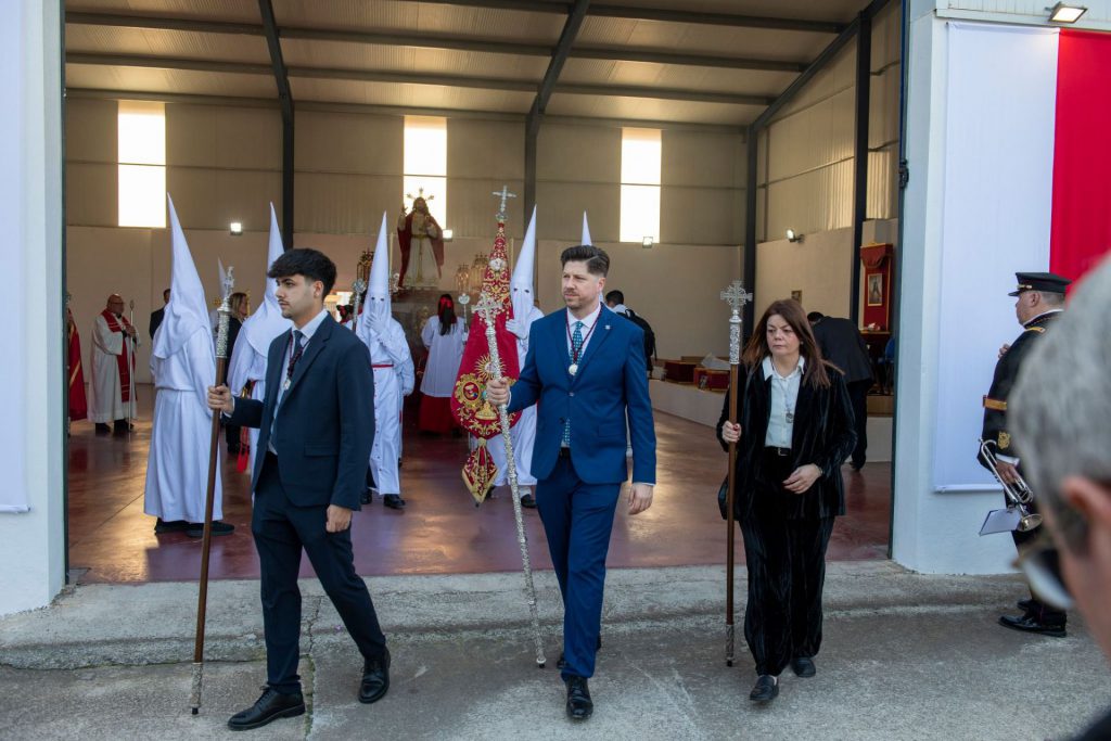 El cortejo sacro del Cristo de la Fe quedaba organizado a puerta cerrada en el propio salón parroquial de la ermita de San Antonio. Allí, minutos antes, se encuentra la alcaldesa de la ciudad, Luisa Mª García Chamorro, junto al consiliario de la Agrupación de Hermandades y Cofradías de Semana Santa, Alejandro P. Anguís Rodríguez, que minutos antes de iniciar la marcha se dirige a los componentes del cortejo para hacerles partícipes del momento que iban a vivir en relación con el pasaje histórico que protagonizó Jesús en su última Cena.