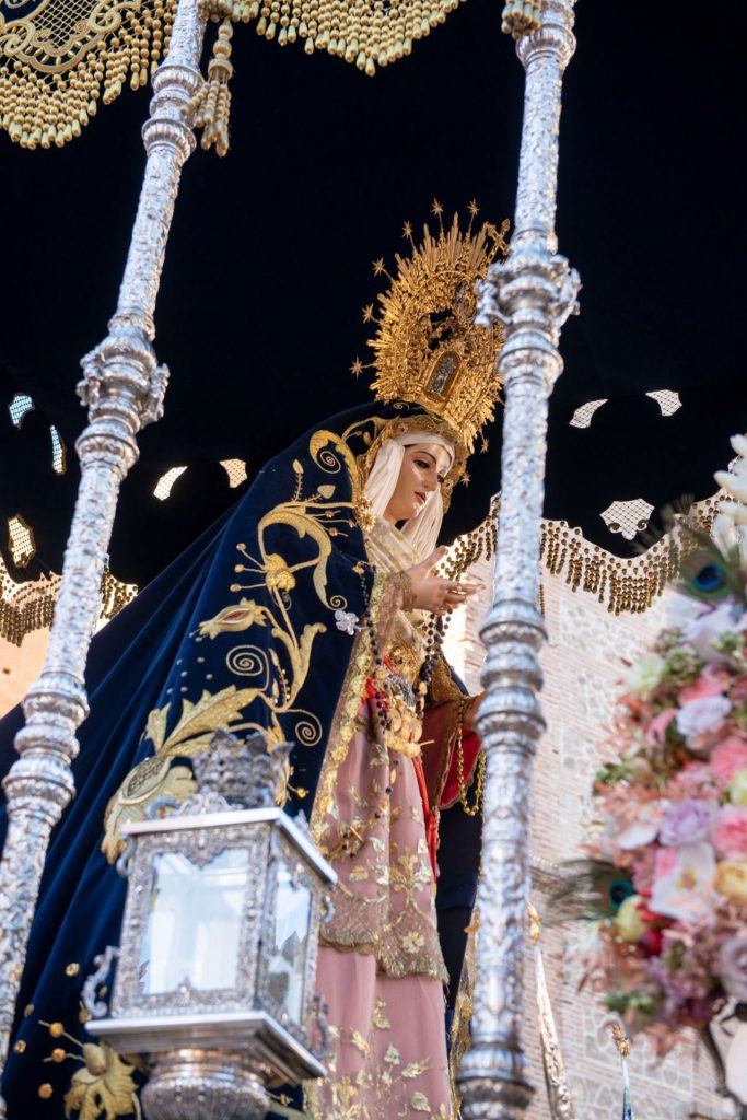 La sección mariana se dispone a continuación con la cruz parroquial y ciriales, a los que siguen los niños componentes del Grupo Joven de la hermandad tocados con hábito de color blanco y capelina de color azul que exhiben pequeñas cruces de madera y cestitas con recordatorios de su imagen titular. La sección penitencial marcha a continuación con los colores que le son propios, hábito blanco y capillo y cíngulo de color azul, y portan en sus manos cirios de cera de color crudo. La sección mariana aparece representada por el estandarte que muestra en su óvalo central la figura pintada al óleo de su titular mariana. Terminada la sección penitencial, marcha el extenso cuerpo de madrinas de la Virgen con las velas que iluminan la senda que ha de seguir el paso de su titular. Ultimado este marcha el cuerpo directivo de las camareras de la Virgen, para dar paso a la “bacalá” que va flanqueada por dos varas presidenciales y que muestra en su centro el cáliz de la última cena rodeado de adornos florales bordados en oro. Seguidamente, la representación eclesiástica que ostenta el consiliario de la cofradía, Padre Antonio Manuel Martín Blanco, junto al párroco de la iglesia de la Encarnación, D. José Ignacio Martínez Garzón, que es quien ha posibilitado que ambos pasos procesionales puedan salir desde la parroquia de la Encarnación. Y, en su centro, la hermana mayor de la cofradía en traje penitencial con distinción del cargo al vestir hábito y capillo de color rojo y capa y fajín de color blanco. Seguidamente, se ha dispuesto el cuerpo de acólitos e incensarios que da paso ya al trono de María Santísima de la Victoria, que dada la bonanza del día luce espectacularmente con toda la candelería encendida. Sobre la canastilla y bajo uno de los palios más espectaculares de nuestra semana santa se alza la imagen de María Santísima de la Victoria, obra original del artista sevillano Pedro de la Rosa, que data del año de 1993. Luce espectacularmente ataviada por su vestidor, Antonio Ruiz Blanco, con la tradicional saya realizada en tisú de color rosa con bordados de hojilla y el espectacular manto de salida que se extiende por toda la trasera del paso. Porta la Virgen la corona de reina gloriosa del cielo, y multitud de joyas que son ofrenda de sus devotos, tales como un rosario de cristal verde oliva con engarces en plata sobredorada que han sido donados por la familia Gutiérrez Sánchez, que son hermanos honorarios de la corporación. También, un broche en plata sobredorada con lapislázuli y otro de igual material con piedras de coral, ambos donados por hermanos de la cofradía. Y, junto a ello, la tiara de bisutería que ha entregado a la Virgen la hermana Evelina Fernández, así como diversas joyas más y un anillo de plata con engaste de cristal esmeralda.
