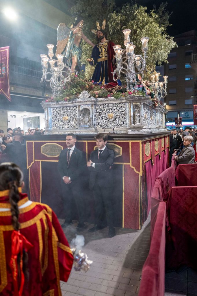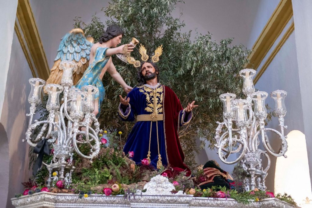 El paso de misterio se dispone a continuación portando sobre su canastilla el pasaje que recrea la escenografía sacra de la Oración de Jesús en el Huerto de los Olivos. Paso monumental donde los haya que representa a Cristo de rodillas junto al Ángel Egudiel que le reconforta, mientras que los apóstoles, absortos en su descanso, se muestran alrededor de Jesús. Ambas imágenes principales han sido realizadas por el artista cordobés Jesús Gálvez Palos en el año de 2016 y el titular va revestido para la ocasión con saya de color azul con bordados en oro que fue estrenada en la semana santa de 2021. Muestra, igualmente, cordón al cuello que se entrelaza en el cíngulo dorado de su cintura y que remata en dos borlas del mismo material.