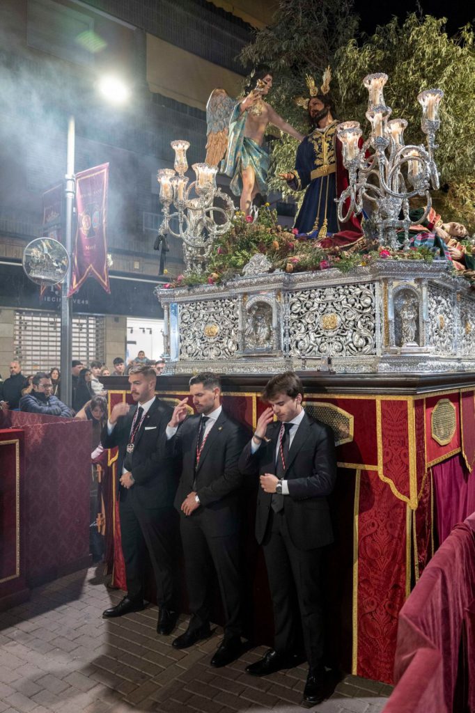 Con la puntualidad que se requiere, la salida penitencial se ha verificado desde la puerta del crucero de la iglesia Mayor, poniendo en la calle a la cruz guía flanqueada por dos faroles, insignia que hace remarcar el carácter cristiano de la manifestación religiosa. Su disposición tiene un sentido catequético, pues está en consonancia con las palabra de San Mateo, si “alguno quiere seguirme, niéguese a sí mismo, tome su cruz, y sígame”. Tras la cruz se dispone el grupo joven de la cofradía, niños en edad infantil que van acompañados por sus madres tocados de hábito penitencial y pequeñas cruces, así como cestas en las que reparten pequeños recordatorios de sus titulares. A continuación marcha la sección penitencial de Jesús de la Humildad, que porta hábito de color blanco y capillo y fajín de color rojo y que portan cirios de color crudo que remarcan la luz de Cristo y su santidad. En su centro, el nuevo estandarte de la sección que es estreno de este año y que exhibe el rosto de Jesús de la Humildad pintado al óleo por el reconocido pintor bastetano D. Javier Mateos Lozano y que marcha escoltado por dos pequeños faroles. Igualmente, acompaña la sección la banderola de la Asociación María de los Sagrarios Calvarios, grupo parroquial que quedó instituido de forma oficial en la iglesia de la Victoria el día 29 de junio de 1920. A continuación, el libro de reglas acompañado de dos varas presidenciales precede a un pequeño grupo de niñas tocadas de hábito de color blanco y capelina de color granate, que portan en pequeñas cestas recordatorios de sus titulares. Sigue la representación oficial del cuerpo de Bomberos de la ciudad que lo hace en calidad de hermanos honorarios de la corporación, a los que acompaña el consiliario de la Agrupación de Hermandades y Cofradías de Semana Santa, D. Alejandro Pablo Anguís Rodríguez. Y, a continuación, el cuerpo de acólitos con ciriales y el propio de los incensarios.