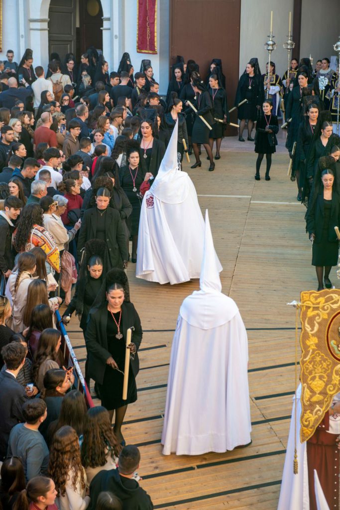En los momentos previos, concretamente a las 19:10 hrs, y con el cortejo de la sección formado ya en la calle, ha salido el paso de Jesús del Perdón desde el salón anexo a la iglesia para situarse en el atrio y erigirse así en el protagonista de la lectura de la sentencia. A partir de aquí, el cortejo ha comenzado la marcha a través de la calle San Roque, itinerario más que novedoso que la junta de gobierno ha tenido a bien realizar para que sus titulares gratifiquen la devoción de sus vecinos. Abre su cabeza la cruz guía escoltada por dos faroles, a los que sigue la sección nazarena que se reviste de túnica de color granate y capillo y capa de color blanco. En el centro de la fila, el emblema del “Senatus”, estandarte que quiere hacer recordar que el misterio de la pasión y muerte de Cristo acontece durante la época de dominación romana. En las filas, igualmente se hace visible la “bacala” que presenta el antiguo estandarte de la hermandad de Jesús Preso que se conserva y que fue la que concertó la hechura de la imagen cristífera con el escultor Domingo Sánchez Mesa. Tras él se extienden los niños que componen el Grupo Joven de la cofradía, uno de los más nutridos y extensos que se ha visto en nuestra semana santa. Visten hábito de color granate y capelina de color blanco y van acompañados en todo momento por las madres que cuidan del buen orden de la sección. Sigue el protocolo de las filas con el libro de reglas de la cofradía, que va escoltado por dos varas presidenciales y da paso al cuerpo de acólitos ceroferarios con su pertiguero al frente, así como los turiferarios encargados de los incensarios.