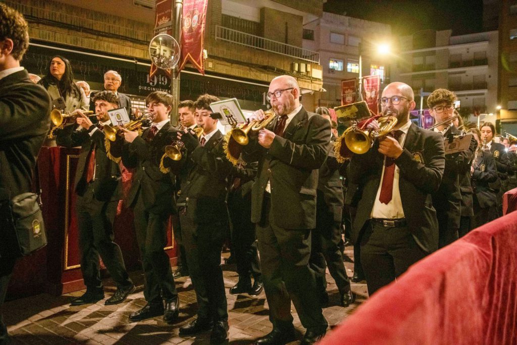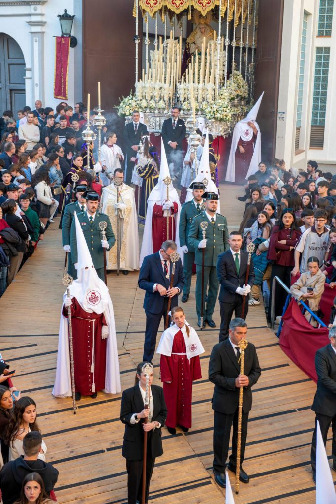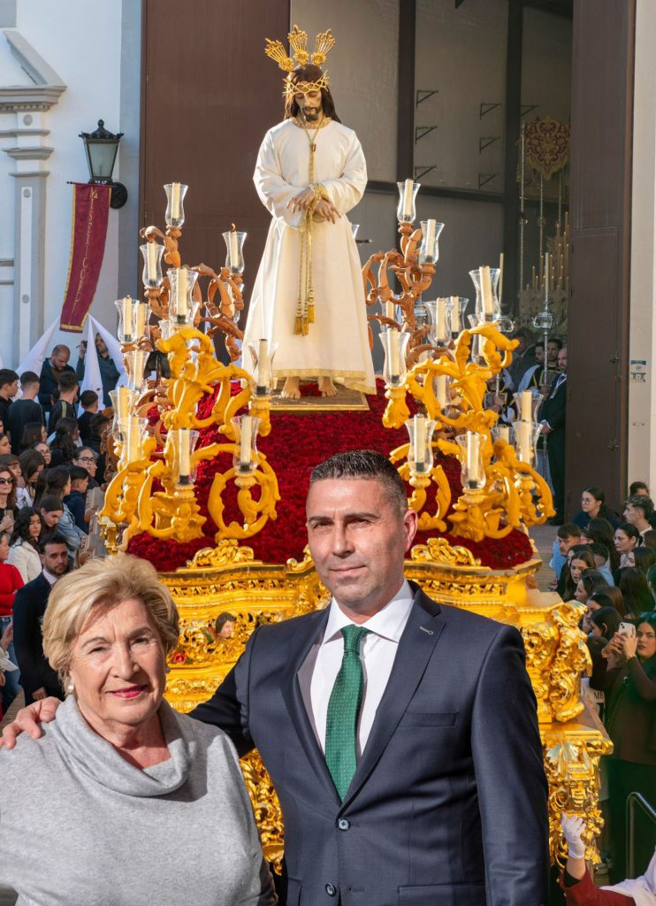 Sobre la canastilla, la impresionante figura de Jesús del Perdón que tallara el escultor Domingo Sánchez Mesa en 1953, que figura sobre un amplio tapiz de claveles de sangre de toro que han sido entregados por sus devotos en el día del viernes de Dolores con motivo de su “besapiés”. Para esta salida penitencial la imagen viste túnica de color blanco sin prácticamente ningún tipo de adorno salvo el bordado de las bocamangas y el ribete de la parte baja. Exhibe cordón al cuello para indicar su condición de reo, cuyos extremos atan las manos y se dejan caer en dos borlas doradas. Como es tradicional, porta la corona de espinas doradas sobre sus sienes y las potencias que coronan su testa para indicar la divinidad de Cristo y su omnipresencia. El paso de Cristo es portado en modalidad de trabajadera sevillana y va comandado por Juan José Díaz Rodríguez, Kiko Rodríguez Tovar, Juan Maldonado Vázquez y Antonio Rivas Lorenzo. Tras el paso, cuatro cruces penitenciales son portadas por nazarenos que cumplen así su “manda” al Cristo del Perdón. Cierra la sección nazarena la Banda de Cornetas y Tambores Nuestra Señora de las Lágrimas de Campillos (Málaga), que ha sabido dar buena cuenta de su saber hacer en el campo de las marchas procesionales, sonido y profesionalidad que el público presente ha sabido gratificarle con sonoros aplausos en sus intervenciones.
