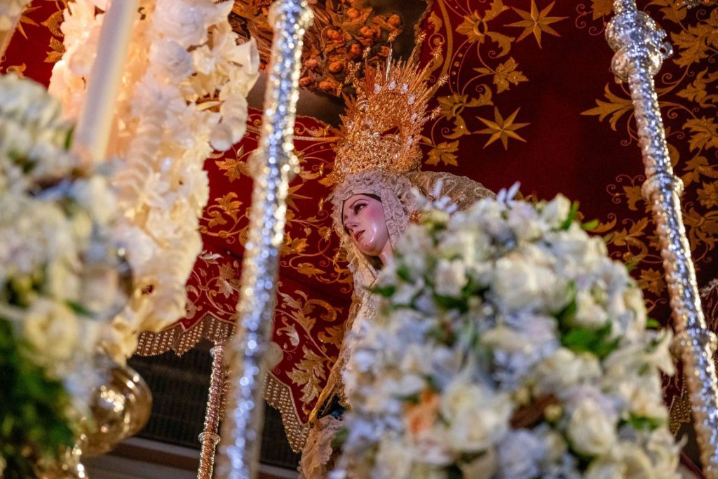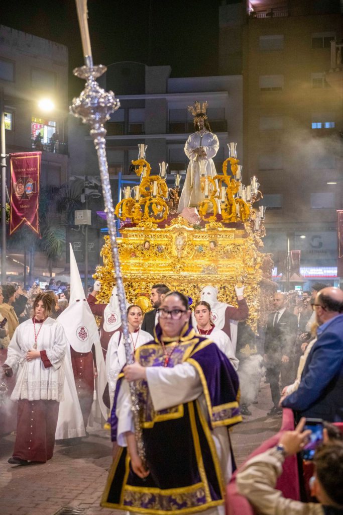 La sección mariana de María Santísima de la Misericordia aparece abierta por la cruz parroquial y dos ciriales a la que siguen las dos largas filas de nazarenos penitenciales que ultiman su sección con el estandarte del cuerpo de mantillas, que este año asiste en mayor número que otros años, completando un total de 94 “camareras” de la Virgen. Finaliza el cuerpo con la “bacalá” corporativa y la representación oficial en la que ha figurado invitada la hermandad de Nuestra Señora de las Angustias que se encuentra enclavada en el mismo barrio, juntamente con el consiliario de la hermandad, D. Alberto Sedano Rodríguez. Tras ellos, el hermano mayor, Daniel Ruiz Peña, en traje penitencial, acompañado de José Miguel Romero Pérez, persona que ha realizado la lectura de la sentencia de Poncio Pilato y Ángel Luis Castillo Márquez, pregonero del XII pregón que se ha celebrado en este año en la ermita de Nuestra Señora del Carmen, a los que ha seguido una representación del cuerpo de la Guardia Civil. Seguidamente se ha dispuesto el cuerpo de acólitos e incensarios que ha dado paso al trono de palio que enseñorea a la reina del martes santo con toda su candelería encendida. La titular mariana es obra del escultor sevillano Juan González García “Ventura”, imagen de vestir que llegó a Motril en 1987. Sobre el impresionante palio bordado que le cubre ha sido ataviada por su tradicional vestidor, Antonio Jesús Hernández Camacho, con su terno de salida que componen la saya bordada en azul pavo que ha sido realizada por la bordadora motrileña Elena Burgos y su manto de salida. Luce, igualmente, dos encajes de Bruselas del siglo XIX y la flor de la pasión en plata bañada en oro, obra del orfebre sevillano Fernando Marjolejo Camargo. Porta, asimismo, un rosario de color negro que es signo de recuerdo y oración a los hermanos fallecidos, junto a otro rosario de piedras rojizas y delicadas piezas de filigrana en plata. El impresionante paso mariano ha sido dirigido en labores de capataz por Francisco Pérez Lorenzo, asistido en labores auxiliares por Juan Arráez Lozano, José Manuel Maldonado Jiménez y Ángel Castilla Mancebo. Cierra la sección mariana la Banda de Música “Felipe Moreno” de Cúllar Vega, que es veterana en estas lides pues repite edición por sexta vez consecutiva. Es de destacar el inicio de su salida, con la “Saeta”, continuada con “Madre Hiniesta” y “Rosario de Montesión”. Y, junto a la casa hermandad del Gran Poder, la siempre emotiva “La Madrugá”. El paso por tribuna igualmente ha sido majestuoso con la marcha “Pasan los Campanilleros”, a la que ha seguido “La Madre de Dios”.