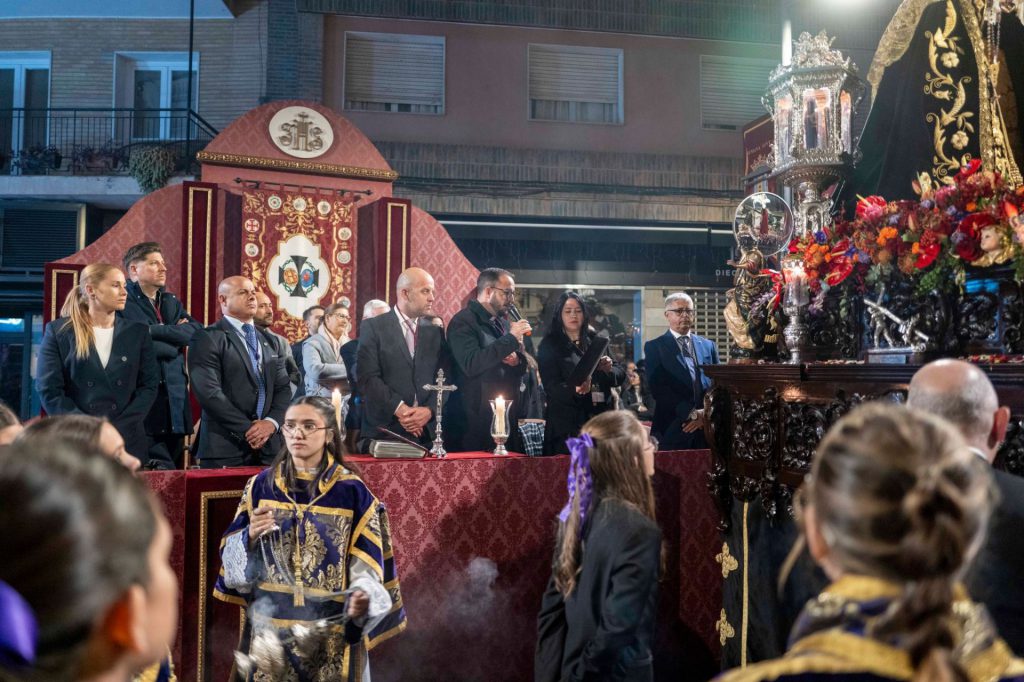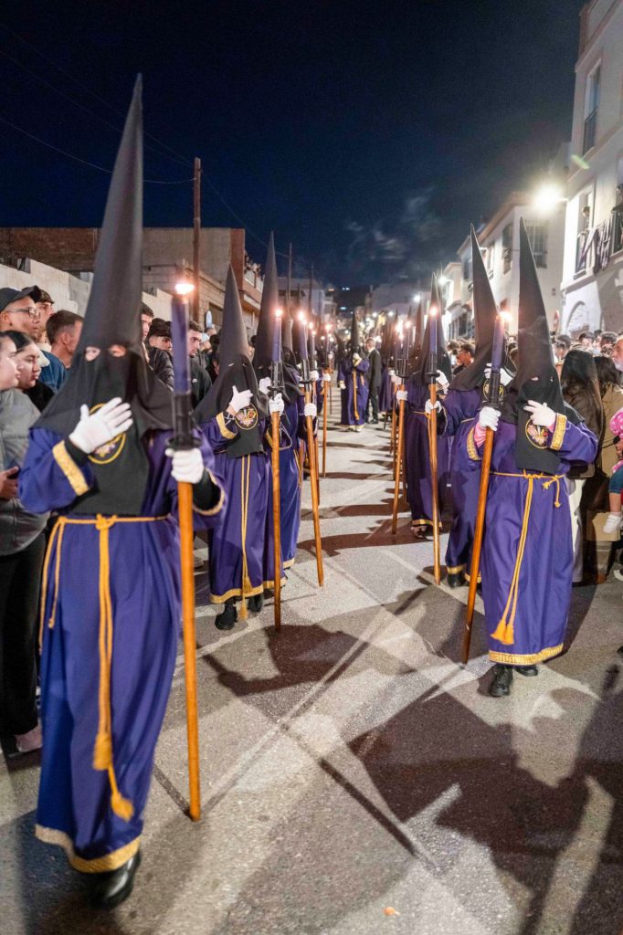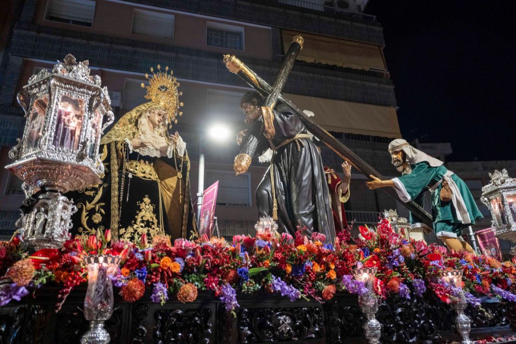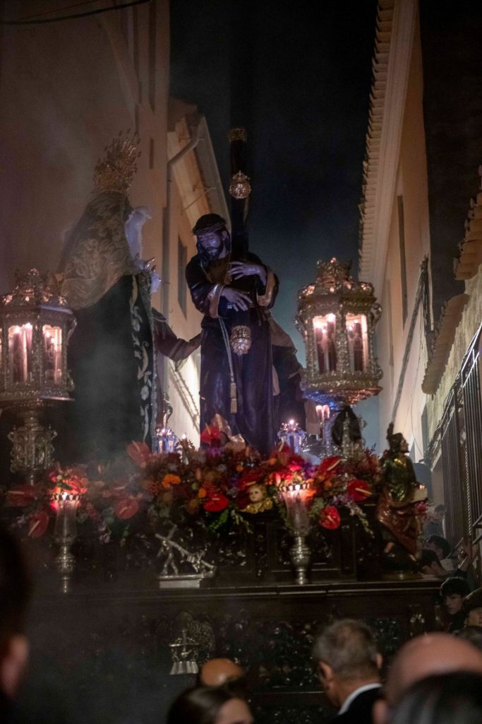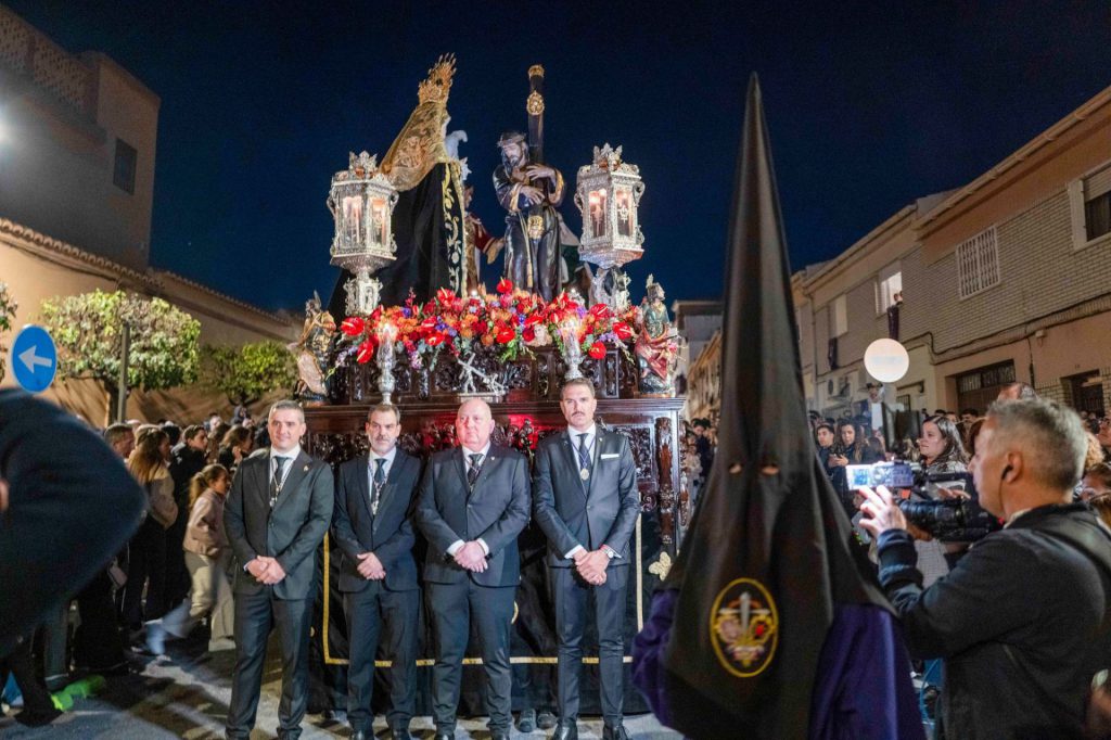 La presidencia oficial ha dado paso al cuerpo de acólitos que precede al monumental paso de misterio. Sobre la canastilla, la imagen de Jesús Nazareno portando la cruz de su martirio, que fue realizada por el escultor granadino Domingo Sánchez Mesa en el año de 1949 y que mantiene similares características a la que el artista talló para el titular de las Tres Caídas de Loja, con la única diferencia del cambio en la forma de portar la cruz. Se trata de una talla completa en madera que enlaza con los modelos clásicos del siglo de oro y que ha sido captada por el escultor en movimiento, al figurar su pie alzado sobre un risco. Particular atención merece su rostro, que gira levemente hacia la derecha e inclina su mirada cargada de plena expresividad. El Nazareno va acompañado por la imagen de María Santísima del Mayor Dolor, obra del imaginero veleño Israel Cornejo, que la pudo tallar en el año de 2023 y que fue bendecida el día 18 de febrero de dicho año en su sede canónica, la iglesia de la Visitación, por el consiliario de la hermandad, D. Alberto Sedano Rodríguez. La imagen de la Virgen ha sido ataviada por su tradicional vestidor, el artista motrileño Jesús Ortega Fernández, figurando para la ocasión con su tradicional saya bordada en hilo de oro sobre terciopelo de color negro al igual que el manto de salida. Igualmente, usa toca de sobremanto y un cíngulo a su cintura rematado por borlas con tradicionales flecos de bellota. La imagen estrena en el día un encaje que ha sido donado por el cuerpo de acólitos y que va colocado de forma muy natural y caído junto al puñal clavado en su pecho que recuerda la profecía de Simeón, además de diferentes joyas y alhajas que son donación de años anteriores. La escena sacra se completa finalmente con dos imágenes accesorias, la efigie de Simón de Cirene que ayuda a Jesús a portar la cruz y la del centurión romano que porta en la mano el flagelo y que es obra del escultor sevillano Manuel Madroñal Isorna. Toda una iconografía sacra que impone en su marcha por las calles ante el impresionante paso que se crece en altura y que hace levantar los ojos hacia el cielo para contemplar la escena de Cristo en su pasión. El paso de misterio ha sido seguido por varios hermanos en penitencia que han recogido las ofrendas de flores que los fieles han entregado a sus titulares. Y, tras ellos, ha cerrado el cortejo la Agrupación Musical de Nuestra Señora del Rosario de Crevillente, que repite edición, pues se incorporaba como instrumentalización musical de la corporación en el año de 2013 y permaneció ininterrumpidamente hasta el año de la pandemia, para efectuar un corto paréntesis que ha recuperado su participación en el presente año.