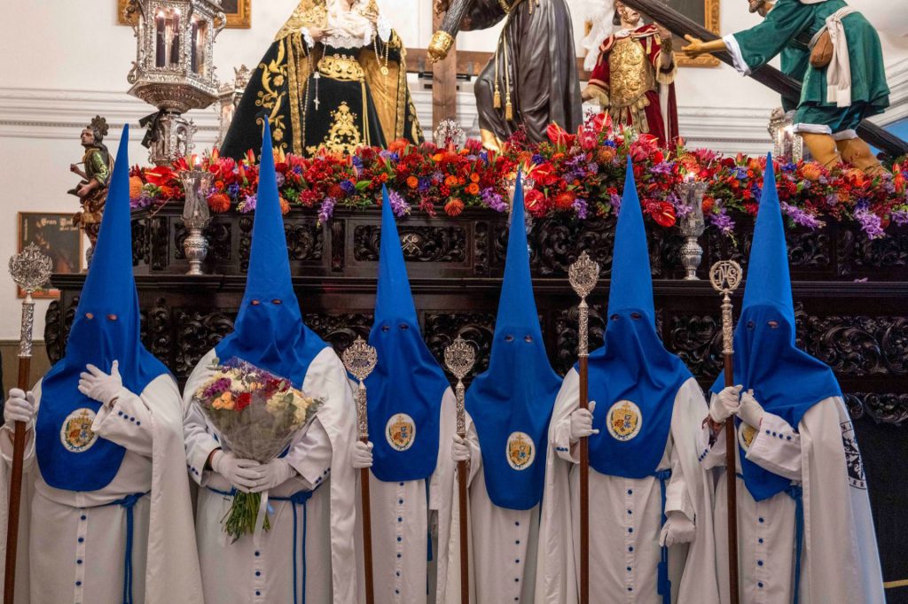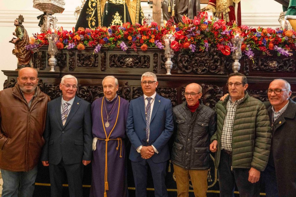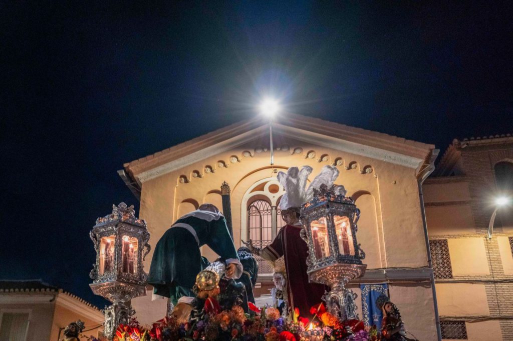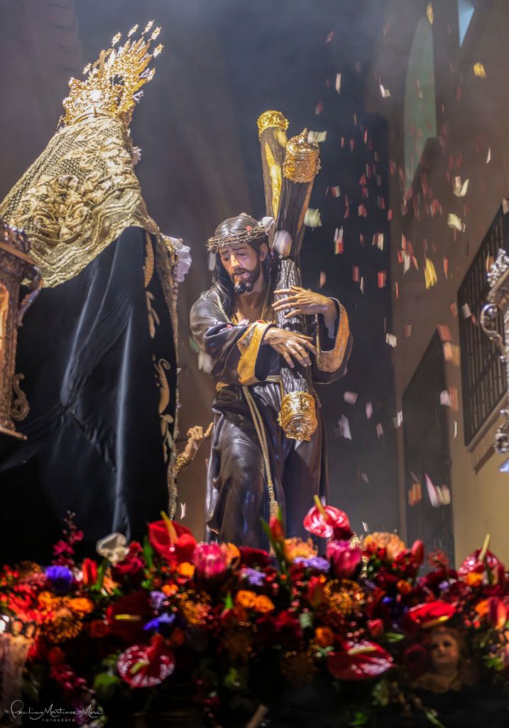 La presidencia oficial ha dado paso al cuerpo de acólitos que precede al monumental paso de misterio. Sobre la canastilla, la imagen de Jesús Nazareno portando la cruz de su martirio, que fue realizada por el escultor granadino Domingo Sánchez Mesa en el año de 1949 y que mantiene similares características a la que el artista talló para el titular de las Tres Caídas de Loja, con la única diferencia del cambio en la forma de portar la cruz. Se trata de una talla completa en madera que enlaza con los modelos clásicos del siglo de oro y que ha sido captada por el escultor en movimiento, al figurar su pie alzado sobre un risco. Particular atención merece su rostro, que gira levemente hacia la derecha e inclina su mirada cargada de plena expresividad. El Nazareno va acompañado por la imagen de María Santísima del Mayor Dolor, obra del imaginero veleño Israel Cornejo, que la pudo tallar en el año de 2023 y que fue bendecida el día 18 de febrero de dicho año en su sede canónica, la iglesia de la Visitación, por el consiliario de la hermandad, D. Alberto Sedano Rodríguez. La imagen de la Virgen ha sido ataviada por su tradicional vestidor, el artista motrileño Jesús Ortega Fernández, figurando para la ocasión con su tradicional saya bordada en hilo de oro sobre terciopelo de color negro al igual que el manto de salida. Igualmente, usa toca de sobremanto y un cíngulo a su cintura rematado por borlas con tradicionales flecos de bellota. La imagen estrena en el día un encaje que ha sido donado por el cuerpo de acólitos y que va colocado de forma muy natural y caído junto al puñal clavado en su pecho que recuerda la profecía de Simeón, además de diferentes joyas y alhajas que son donación de años anteriores. La escena sacra se completa finalmente con dos imágenes accesorias, la efigie de Simón de Cirene que ayuda a Jesús a portar la cruz y la del centurión romano que porta en la mano el flagelo y que es obra del escultor sevillano Manuel Madroñal Isorna. Toda una iconografía sacra que impone en su marcha por las calles ante el impresionante paso que se crece en altura y que hace levantar los ojos hacia el cielo para contemplar la escena de Cristo en su pasión. El paso de misterio ha sido seguido por varios hermanos en penitencia que han recogido las ofrendas de flores que los fieles han entregado a sus titulares. Y, tras ellos, ha cerrado el cortejo la Agrupación Musical de Nuestra Señora del Rosario de Crevillente, que repite edición, pues se incorporaba como instrumentalización musical de la corporación en el año de 2013 y permaneció ininterrumpidamente hasta el año de la pandemia, para efectuar un corto paréntesis que ha recuperado su participación en el presente año.