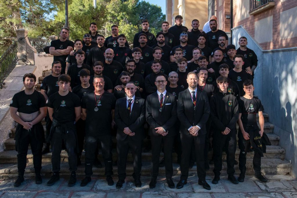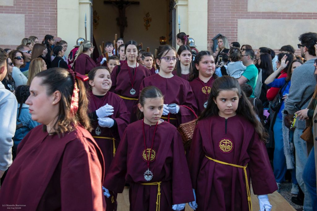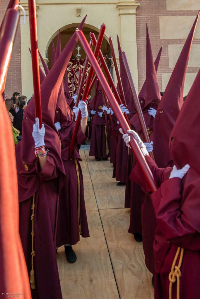 Tras la cruz guía se despliega el Grupo Joven de la hermandad, que este año sorprende por el gran número de niños que participa y que van vestidos con el hábito de la hermandad de color granate y cíngulo de color amarillo sujeto a su cintura. Destaca el perfecto orden de la chiquillería que camina siguiendo a sus madres que actúan a modo de fiscales de fila controlando que todo discurra con normalidad. Los niños de mayor edad portan cestitas a través de las cuales reparten recordatorios del titular cristífero, existiendo igualmente una sección que porta pequeñas cruces de madera al hombro con sentido penitencial. Seguidamente se abre la sección que exhibe el emblema del “Senatus”, con el acrónimo “SPOR” bordado en oro sobre terciopelo de color granate. El símbolo viene a exponer a los fieles que la detención de Jesús se ha efectuado bajo dominio romano, y así efectivamente se deja ver con los dos soldados que escoltan el emblema y que van provistos de dos picas. A continuación se disponen las dos filas de penitencia que portan cirios de cera roja en las manos para significar el hecho de la pasión. En su centro, igualmente se hace destacar el libro de reglas escoltado por dos varas presidenciales, al que sigue la bandera pasionista y, posteriormente, el estandarte cristífero que lleva en su óvalo central el rostro del Redentor pintado al óleo. De extraordinaria belleza es, asimismo, el soporte textil que lo expone, con un intenso bordado en hilo de oro con motivos florales que está rematado con flecos dorados. Seguidamente, marcha la sección propiamente penitencial que porta sobre los hombros pequeñas cruces de madera, a cuyo término se ubica la “bacalá” corporativa que muestra el escudo pasionario en su centro y que igualmente va escoltado por dos varas presidenciales. Tras ellos marcha el Cuerpo de la Policía Nacional, que son hermanos honorarios y que dispone, igualmente, de una sección de veteranos que desfilan con sus trajes oficiales. Desde luego es importante resaltar la trascendencia que con los años ha alcanzado el cuerpo, que cada vez aporta un mayor número de policías; éste, en concreto, ha superado el número de la cincuentena.