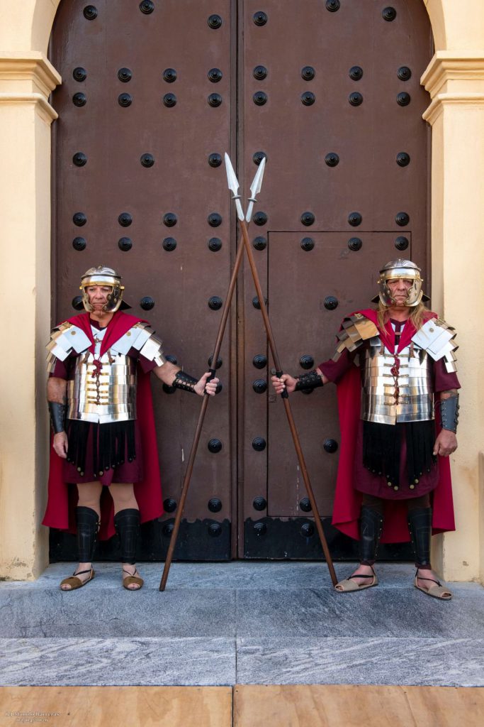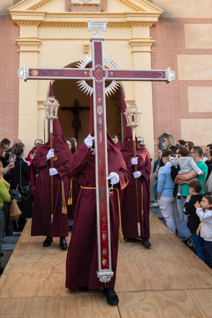 Desde primeras horas de la tarde, las puertas de la ermita permanecen escoltadas por dos soldados romanos que portan en sus manos las picas cruzadas que impiden su acceso. Llegada la hora de partida, el cortejo sacro sale en perfecta formación para desplegarse a lo largo de la cuesta a la ermita. Abre su cabeza la cruz guía, que es un auténtico estreno de este año y que va escoltada a muy corta distancia por dos faroles de frente de procesión. Impresionan sus dimensiones y el propio diseño, que es obra del escultor granadino Pablo Fernández Hurtado. Muestra la misma técnica mixta de pintura al óleo sobre pintura acrílica con fondo de color rojo. Tanto en el “estipes” como el “patíbulum” se detallan las armas de Cristo que se encuentran asociadas a la pasión y que simbolizan su sufrimiento. También aparecen las armas que hacen que Jesús pueda vencer a la muerte. Así se muestran símbolos pasionistas como la lanza, la caña, la esponja de vinagre, los tres clavos, dos escaleras, tres dados, la bolsa con treinta monedas de Judas, la barrena, el paño de la Verónica, la bofetada, el gallo, la columna, el martillo, los flagelos, las tenazas, la túnica…etc. Todo un corpus catequético de elementos que remiten a la pasión de Nuestro Señor.