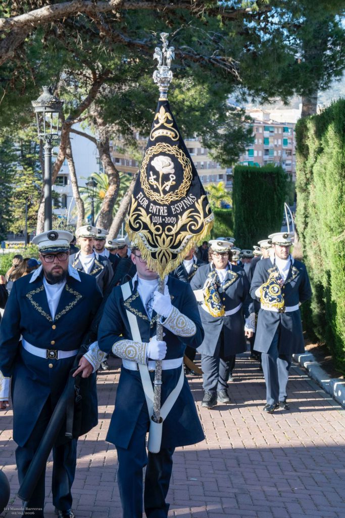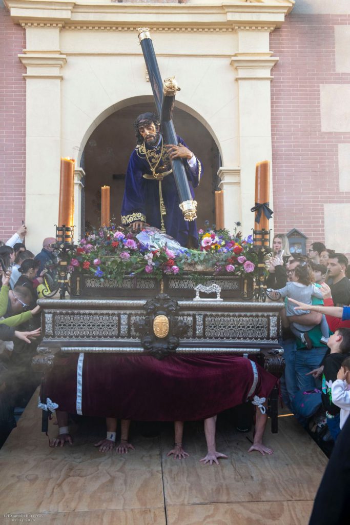 Tras ellos se hace presente la representación de personas e instituciones invitadas por la hermandad. Lo hace en primer lugar la representación de la hermandad de la Divina Pastora, que comparte devoción con el hermano mayor de la hermandad de Jesús de Pasión, Sergio Segura Chamorro, en la iglesia de Capuchinos. Seguidamente, la propia de la cofradía de la Soledad en traje penitencial por el hermanamiento que mantiene vigente la cofradía desde hace más de treinta años, y la presidencia oficial que ostenta el diputado nacional Carlos Rojas García junto a la concejala de participación ciudadana Inmaculada Torres Alaminos y el comisario jefe de la Policía Nacional, José Luis Delgado Ortega, máxima representación del cuerpo que anteriormente ha desfilado en el cortejo. Tras ellos, la representación eclesiástica que ostenta el consiliario, D. Hermes Moreno Arias, acompañado del hermano mayor de la hermandad, Sergio Segura Chamorro en traje penitencial. Seguidamente, dos hermanos nazarenos portan sendas bocinas para recordar que en la antigüedad estos instrumentos de viento anunciaban la inmediatez de un cortejo sacro. Finalmente, el cuerpo de acólitos e incensarios precede al paso de misterio que muestra sobre su canastilla la imagen de Jesús de Pasión, obra del escultor granadino Antonio Barbero Gor. Le representa cargado con la cruz en una de sus caídas y es, sin duda, la más real y cercana de todas cuantas radican en la costa granadina. En ninguna otra se plasma el dramatismo en la forma que lo hace Nuestro Padre Jesús de Pasión, advocación que toma de la cofradía que le da culto y veneración. Desde el punto de vista artístico la imagen sigue fielmente los rasgos tipológicos que caracterizan la obra de Antonio Barbero Gor. Es una imagen de grandes dimensiones; supera incluso el tamaño natural y ha sido tallada en madera de pino de Flandes. Le representa caído, sujeto por la mano derecha a un risco elevado y por el mismo pie a una peña de menor altura. Ambos elementos actúan de soporte a la impresionante figura de Cristo que parece cobrar vida propia. Le muestra desnudo, aspecto que el artista ha cuidado en extremo dada la formación y la especialidad docente que ha impartido en la facultad de Bellas Artes de Granada. Resulta así una figura corpulenta, de aspecto vigoroso y, en cierto modo, atlético, dado el tratamiento de la musculatura en ambas extremidades y torso. Particular atención merece la disposición de su mano derecha, en postura forzada y en tensión para simular el esfuerzo sobrehumano que realiza el Nazareno para intentar levantarse. La imagen tan solo aparece cubierta con un pequeño paño de pureza que está anudado a su cadera derecha mediante un cordel natural. Antonio Barbero simplifica aquí este aderezo tomando en cuenta la recomendación de la hermandad ya que a pesar de su desnudez se tiene la intención de procesionarle vestido. El artista quiso así evitar las típicas deformidades que pudieran aparecer bajo la túnica plasmando, pues, un paño raso, aplastado y casi pegado a la piel. Por lo que respecta al rostro, muestra una marcada composición triangular cuyo vértice se encuentra en la barba, dispuesta sin partir y con abundantes rizos de profunda talla. Bajo el bigote, de volumen más superficial, se deja ver la boca entreabierta para evidenciar el sufrimiento del ser. En su interior se aprecia el fino trabajo del escultor al labrar la dentadura al completo así como el carnoso labio inferior. La nariz es recta y remarcada, quedando sobre ella el arranque de unas cejas pobladas y circunflejas que acentúan el patetismo de la figura. Los ojos, finalmente, se inscriben en unas orbitas muy pronunciadas. Están pintados, incluso al detalle, con pestañas de finos trazos policromados, remarcándose su sentimiento a través de una mirada baja, triste y melancólica. Porta asimismo el Nazareno corona de espinas naturales que se impone sobre una cabellera tallada a través de voluminosas guedejas que se abren y caen libremente sobre su espalda. Resalta igualmente la policromía oscurecida que le imprime el artista y el tono dramático que le confieren los restos de sangre en la frente y cuello. La imagen, en este ejercicio penitencial de 2026, ha sido revestida con túnica de color morado. Como es habitual, el paso de misterio es dirigido en labores de capataz por Pablo Alberto Rincón Correa. Cierra finalmente el cortejo del jueves santo la banda de cornetas y tambores “Flor entre Espinas” de Loja, que lo hace por tercer año consecutivo y que ha destacado por la brillantez de sus sones y la calidad en la interpretación de las marchas procesionales.
