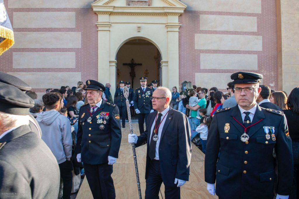 A temprana hora, los accesos al santuario de Nuestra Señora de la Cabeza muestran un ajetreo que no es nada habitual, con gentes accediendo a la ermita, pero, sobre todo, penitentes revestidos de hábito de color granate con el capirote en la mano. Y, como no, el gran número de miembros del cuerpo de policía nacional que suben la cuesta ya que han de figurar en el cortejo penitencial como hermanos honorarios de la cofradía. Hasta allí se desplaza igualmente la alcaldesa de la ciudad, Luisa María García Chamorro, para desear una buena jornada penitencial al cuerpo directivo de la corporación.