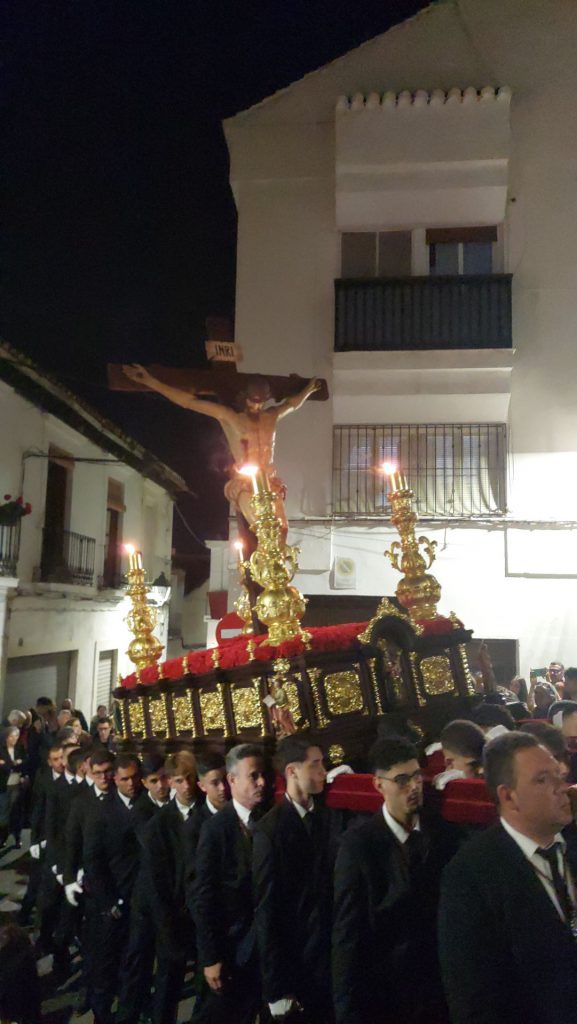 Por lo que respecta al cortejo del Santísimo Cristo del Perdón, iniciaba su estación de penitencia a las 22:30 h con la peculiaridad del silencio que se ha vivido en las calles durante su paso. El recorrido marcado por su actual junta de gobierno transcurrió por la calle Postigo, Antequera, Carmen, Cochera, Puerta de la Villa, Real, Plaza del Museo, Bóveda, Martín Recuerda, Callejón Estación, Estación, Torre y de aquí a su encierro en su casa Hermandad.  La cofradía del Santísimo Cristo del Perdón es de las llamadas “silentes”, y estuvo acompañada por la música de capilla del grupo “Ministriles de Aixa”, que desde hace muchos años les acompaña durante su estación de penitencia interpretando piezas de música sacra barroca, renacentista y del periodo romántico.