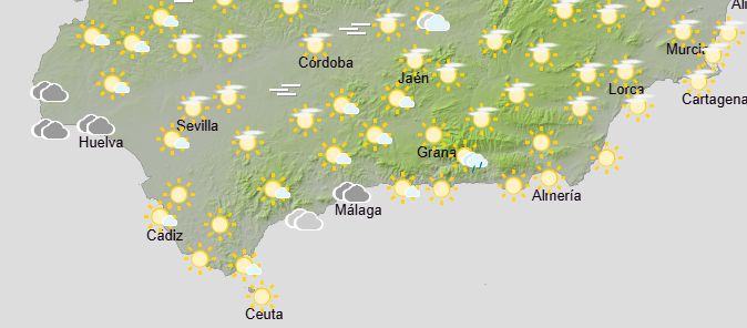 La Aemet anuncia para hoy en Andalucía: intervalos de cielos muy nubosos en el tercio occidental, acompañados de precipitaciones moderadas; cielos poco nubosos en el resto, con intervalos de nubes bajas matinales en la mitad occidental. Polvo en suspensión, produciéndose depósitos de barro. Temperaturas mínimas en ligero descenso en el valle del Guadalquivir, con cambios ligeros en el resto; máximas en ascenso, notable o extraordinario en amplias zonas. Vientos moderados de componente este en el tercio oriental, con intervalos fuertes y rachas muy fuertes en el litoral y en cotas altas; flojos variables en el resto, con intervalos moderados del sureste.