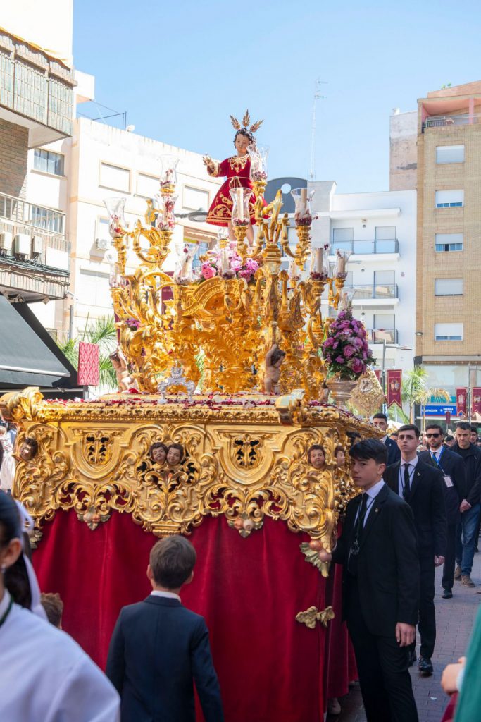 A continuación, el cuerpo de ciriales e incensarios que ha dado paso al trono triunfal del Dulce Nombre de Jesús. La imagen representa al Niño Dios de pie, en actitud triunfante y con los brazos alzados en actitud de bendecir a los fieles. La efigie es obra del artista Miguel Ángel González Jurado, nacido en Stuttgart aunque de ascendencia cordobesa, que la pudo culminar en el año de 1992. La imagen presenta similar traza a la realizada en 1994 para la hermandad de la Estrella de Córdoba en el año de 1994 y que pretende representar la vida evangélica de Jesús Niño. En el año de 2019, dado su deterioro, la imagen del Dulce Nombre fue sometida a un proceso de restauración por su autor.