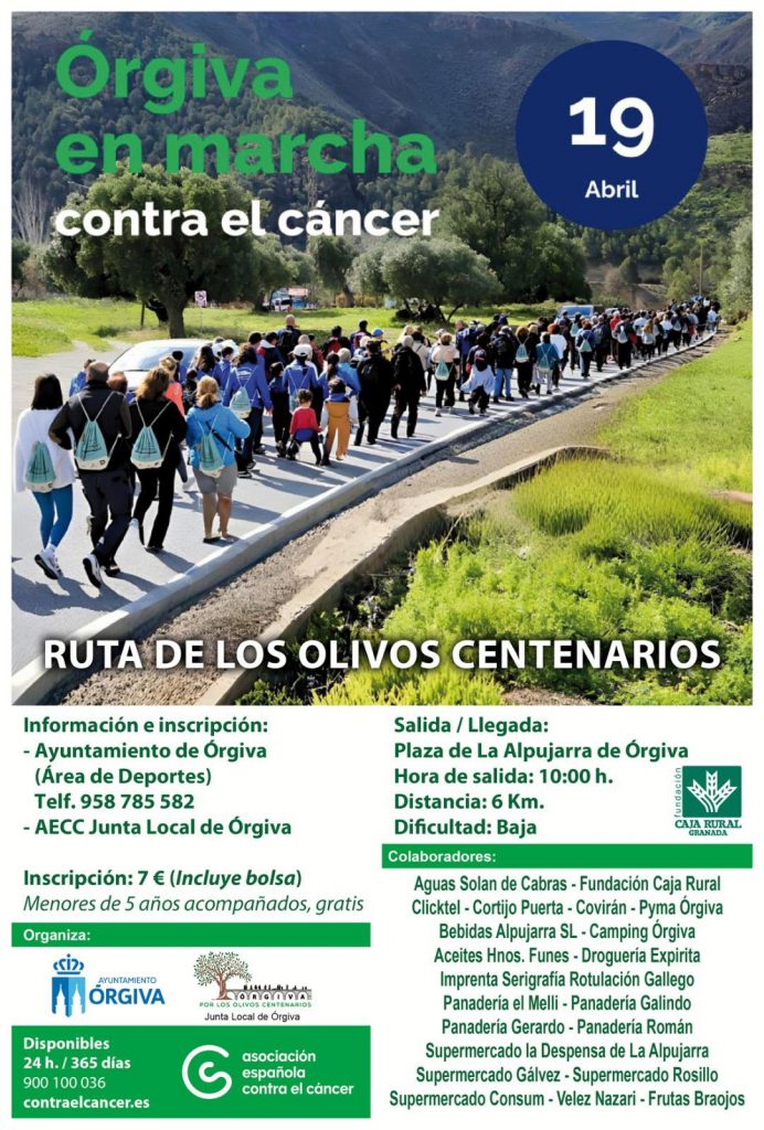 El Ayuntamiento de Órgiva y la Junta Local de la Asociación Española contra el Cáncer de la localidad, en colaboración con la Policía Local, Protección Civil y distintos comercios de la localidad, vuelven un año más a hacer un llamamiento para participar el próximo domingo día 19 de abril en la marcha solidaria Caminando Contra el Cáncer.