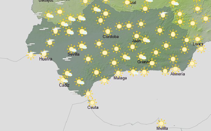 La Aemet prevé para hoy en Andalucía: cielos poco nubosos o despejados, con nubosidad de evolución diurna en las sierras y sin descartar brumas y bancos de niebla matinales en el bajo Guadalquivir. Temperaturas en ascenso generalizado. Vientos flojos variables.