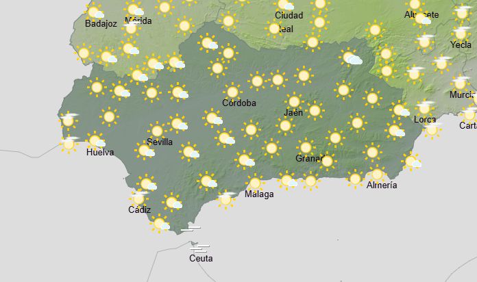 La Agencia Estatal de Meteorología prevé para hoy en Andalucía: cielos poco nubosos o despejados. Nubosidad baja, brumas y bancos de niebla matinales en el litoral mediterráneo. Nubosidad de evolución diurna en las sierras orientales, sin descartar algún chubasco ocasional acompañado de tormenta. Temperaturas con pocos cambios. Vientos flojos variables, con intervalos moderados del sureste por la tarde. Levante fuerte en el Estrecho.