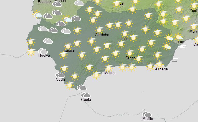 La Aemet anuncia para hoy en Andalucía: cielos con intervalos nubosos de nubes medias y altas, sin descartar precipitaciones débiles ocasionales en las sierras. Nubes bajas matinales en el área del Estrecho. Entrada de polvo en suspensión por el Golfo de Cádiz durante la madrugada. Temperaturas en ascenso generalizado, localmente máximas en descenso o sin cambios en la vertiente atlántica. Vientos flojos variables, tendiendo a soplar moderados de componente sur en la mitad occidental de la comunidad durante la tarde. Levante fuerte en el Estrecho, sin descartar rachas ocasionalmente muy fuertes.