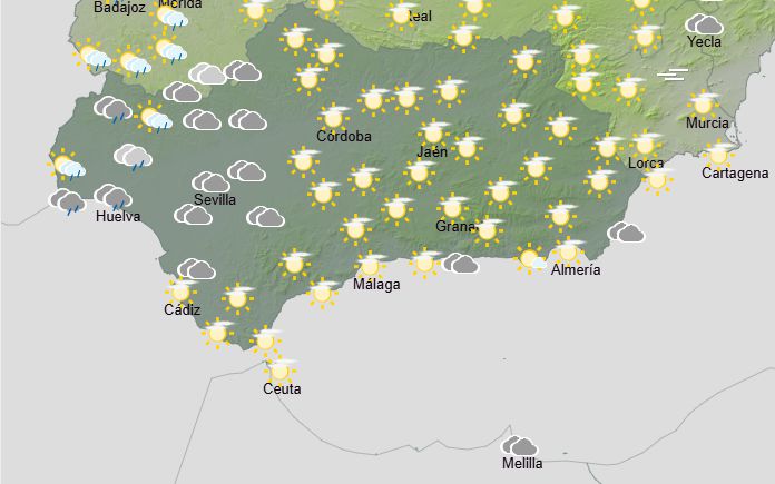 La Aemet prevé para hoy en Andalucía: cielos con intervalos nubosos de nubes medias y altas, sin descartar precipitaciones débiles en el tercio occidental y sierras del resto. Intervalos de nubes bajas matinales. Polvo en suspensión. Temperaturas mínimas con cambios ligeros; máximas en descenso en el litoral mediterráneo, en ascenso o sin cambios en el resto. Vientos flojos variables, tendiendo a componente este en la mitad oriental y en el Estrecho; aumentando a fuertes en Almería, con rachas ocasionalmente muy fuertes en el litoral, donde se ha activado aviso amarillo.
