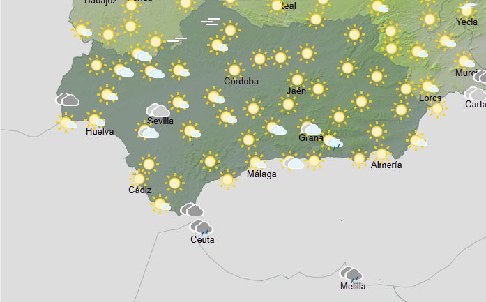 La Aemet anuncia para hoy en Andalucía: cielos poco nubosos, con intervalos de nubes bajas y nubosidad de evolución diurna en las sierras que puede ir acompañada de chubascos dispersos. Temperaturas mínimas en ligero descenso o sin cambios; máximas en ascenso generalizado. Vientos flojos a moderados de componente este, ocasionalmente fuertes en el litoral almeriense y en el Estrecho, con rachas muy fuertes.